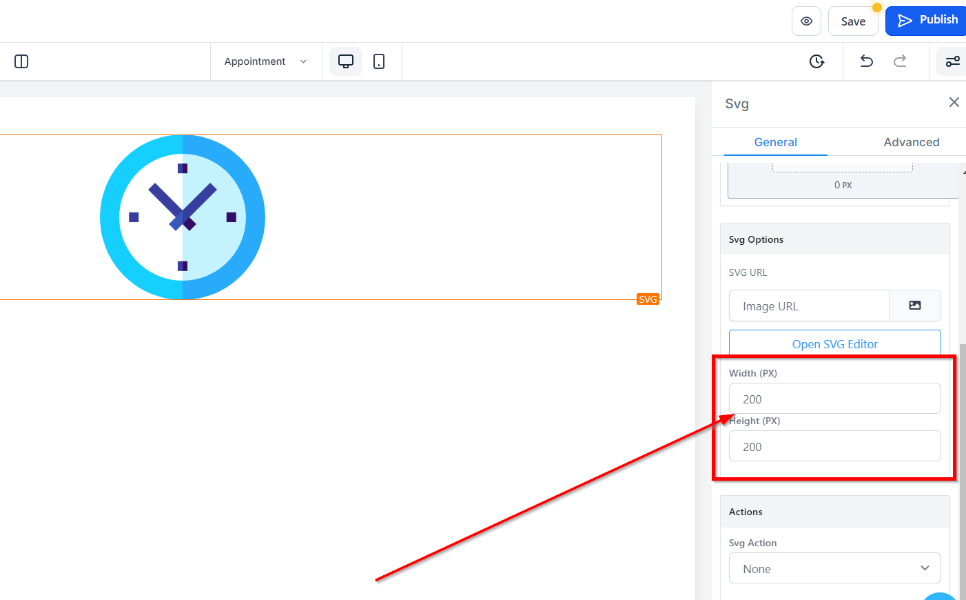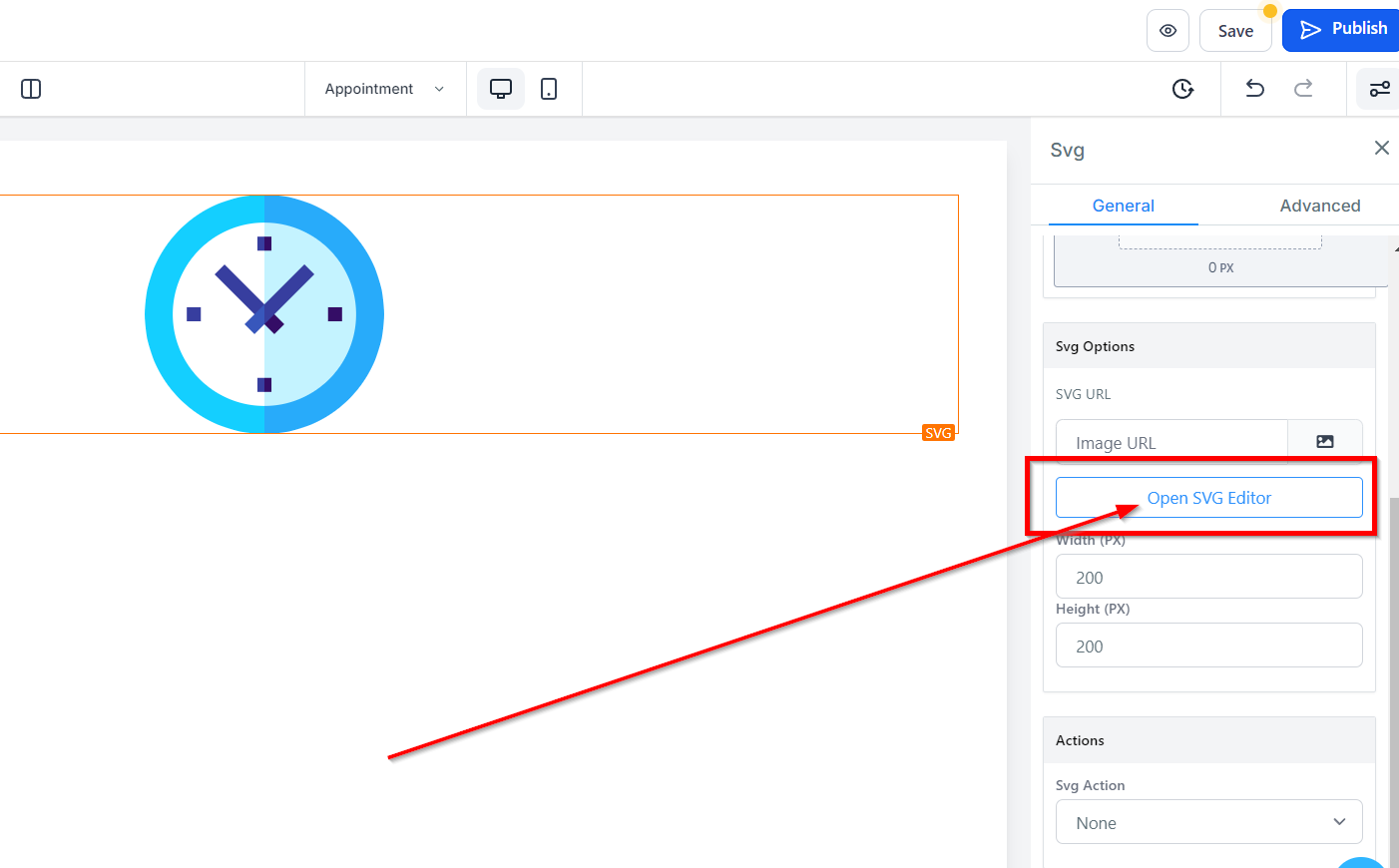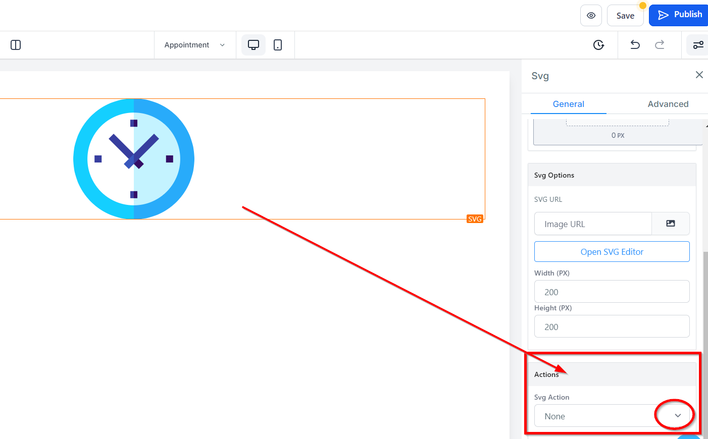 Within the Action settings for SVG, you can decide between two options: either open a popup or redirect users to a specific website URL. Select your preferred action through the Image Action icon.