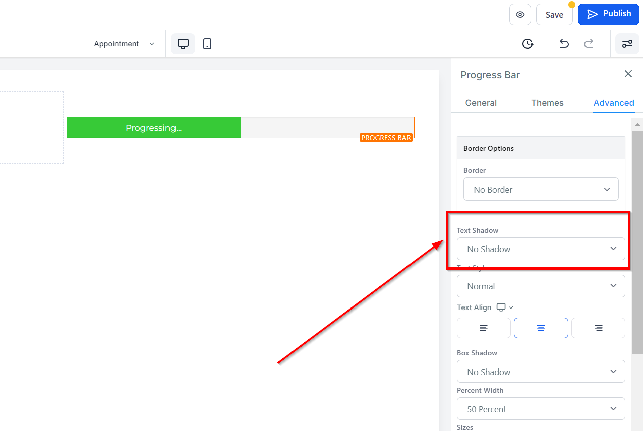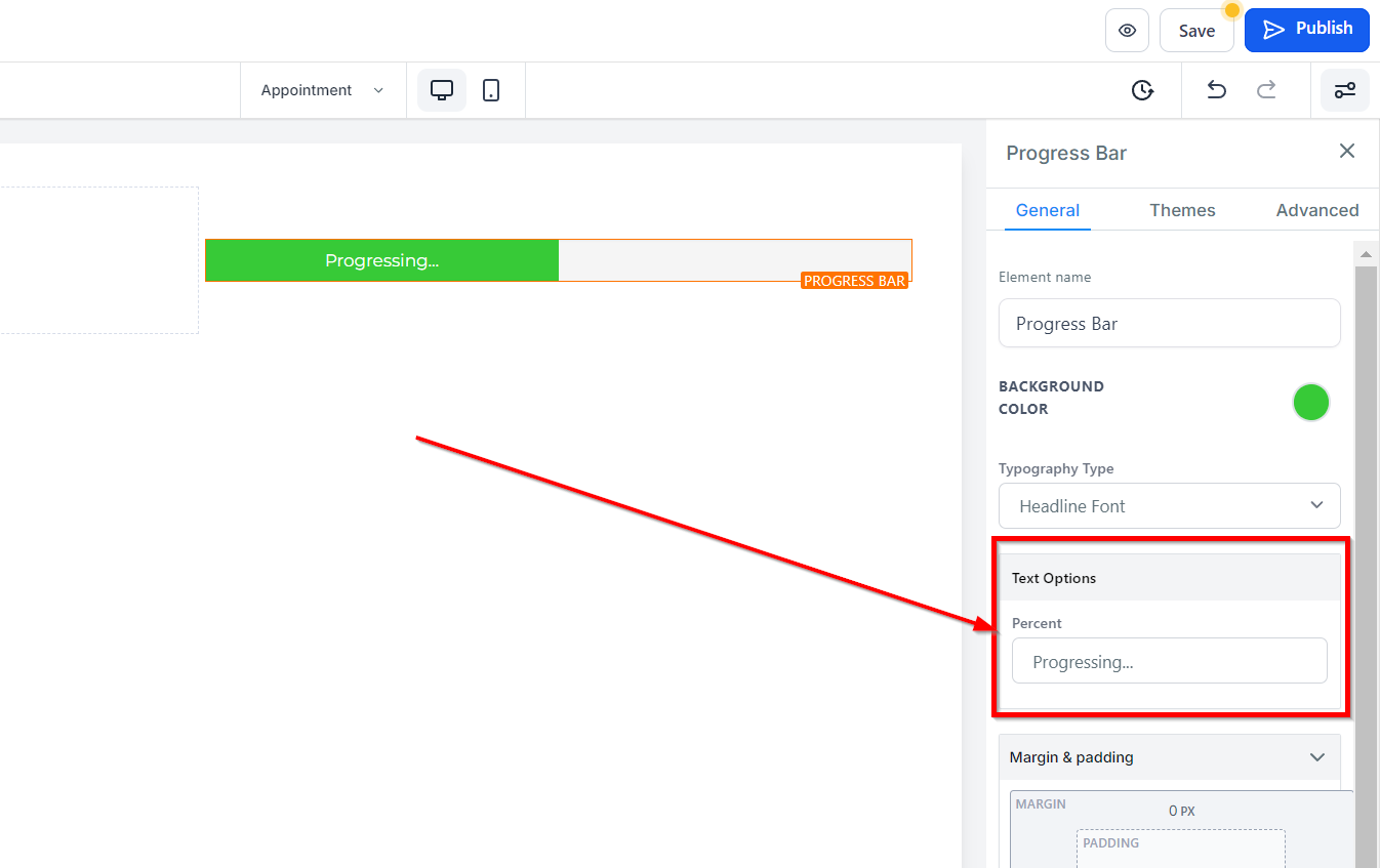 Within the Text Options, you can add or modify the text that appears within the progress bar, such as percentages.
