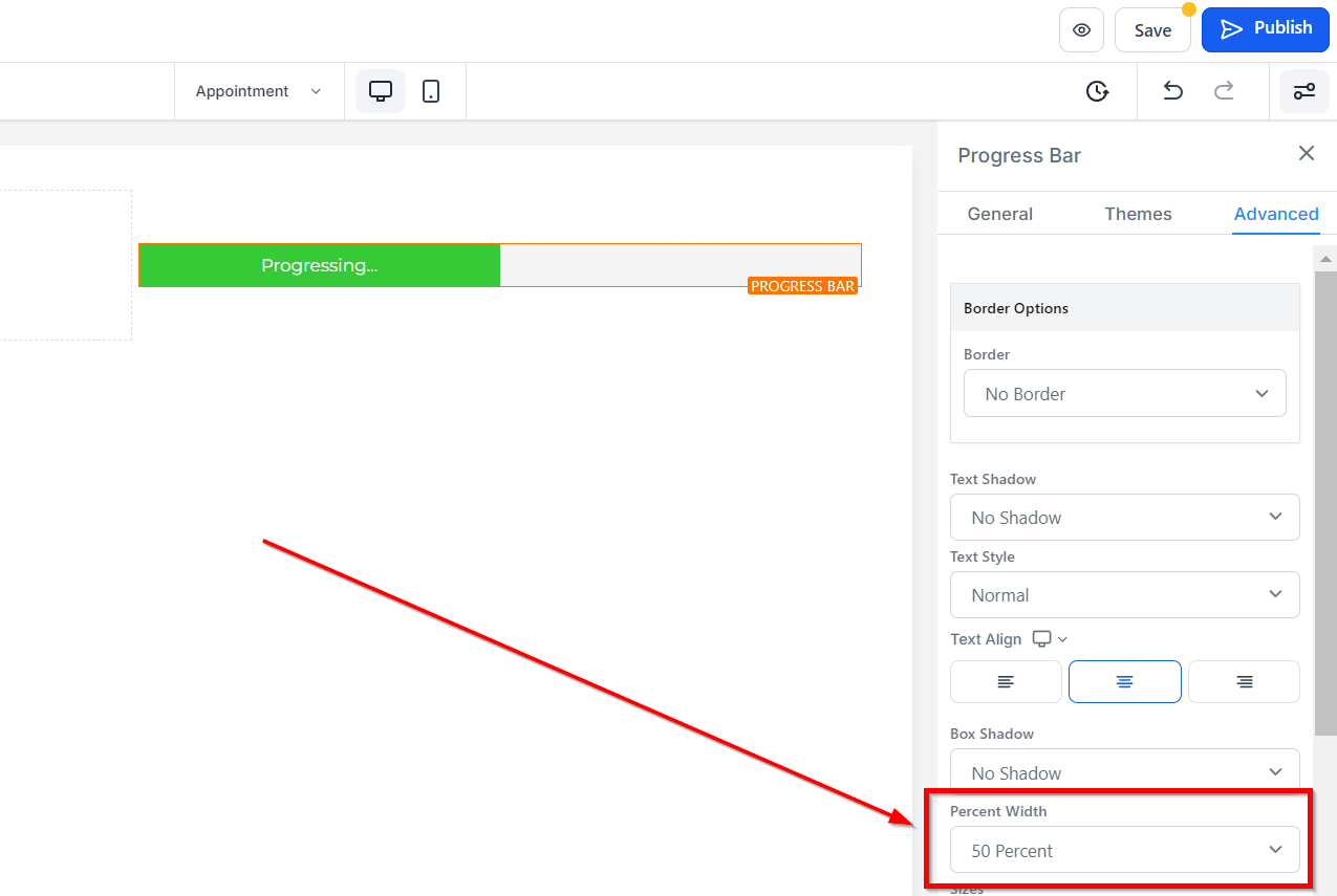 The Percent Width setting allows you to decide how wide your progress bar should be within its container, from 0% to 100%. Additionally, you can adjust the height of the bar using the Sizes dropdown, choosing between small, medium, or large.