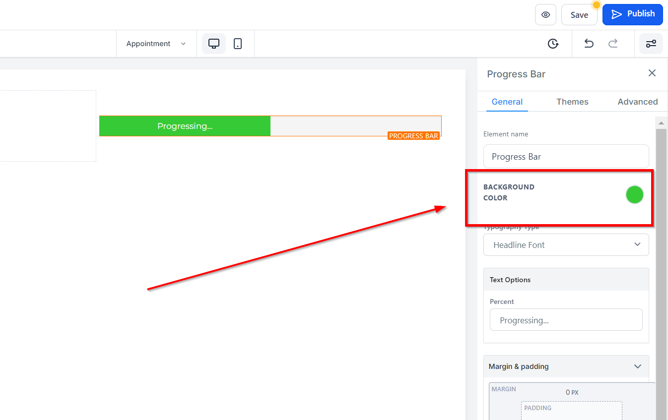 To change the background color of the progress bar, simply select the area you want to modify and choose from preset colors or input a custom color code.
