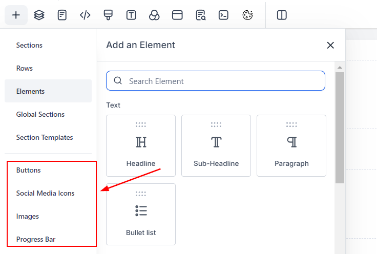 To add these elements, open the Funnels/Websites Builder and access the toolbar on the left by clicking the "+" button.