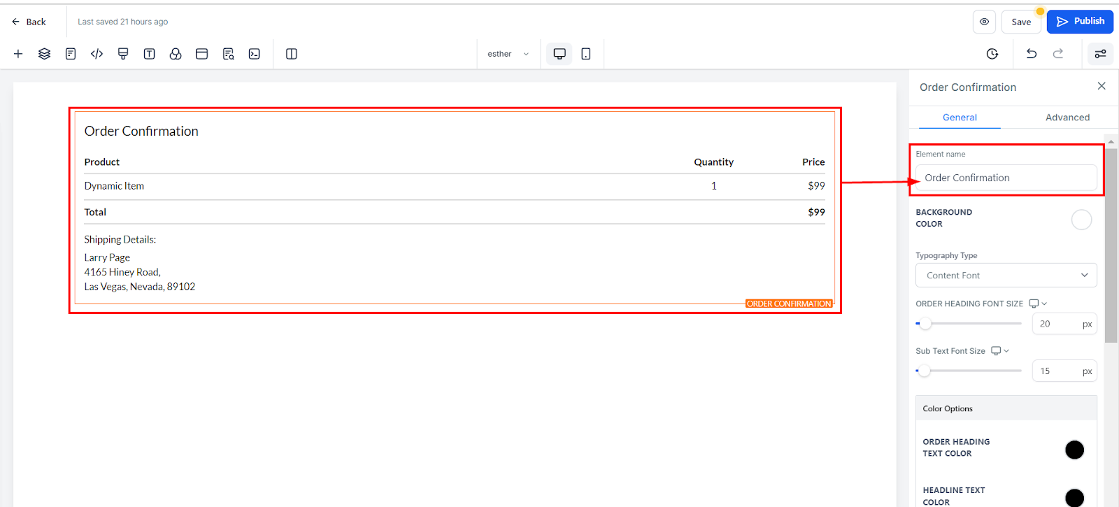 The Confirmation of Purchase feature enables you to integrate a confirmation section into your funnel page. This is especially useful when capturing orders on a previous page and having a confirmation page as the following step in your funnel. Upon adding this element, a range of customization options will be accessible from the left-hand menu of the builder.