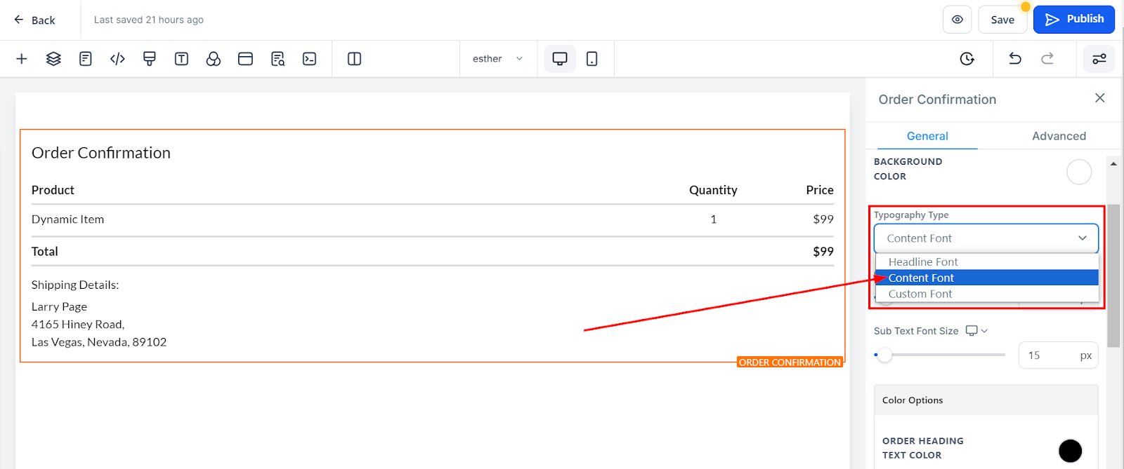 Font Style: You can choose a font style for your order confirmation element by selecting from a dropdown. The available options include either fonts you previously set for headlines and content or custom fonts. If you opt for a custom font, simply click "Default Font" to browse various options.