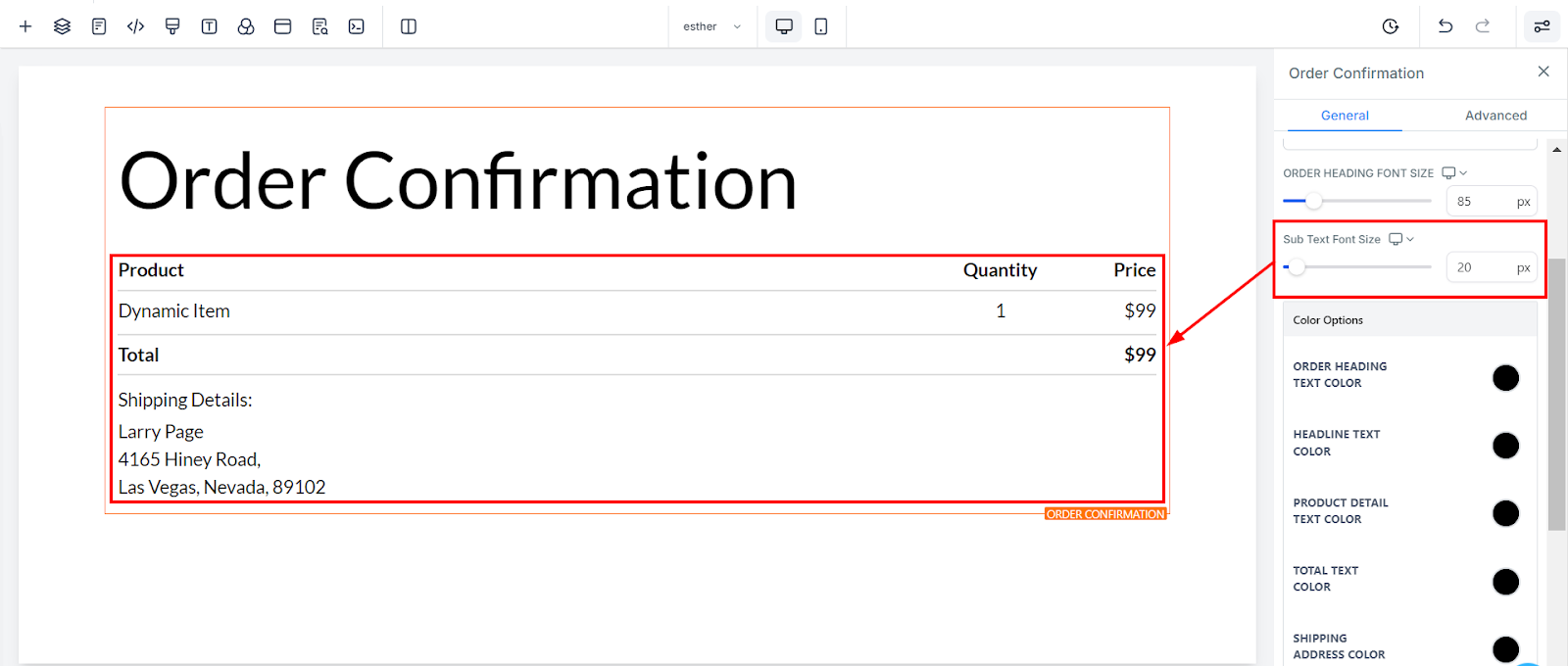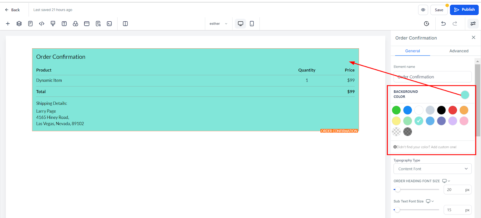 Background Shade: To change the background shade of your order confirmation element, click on the color icon and select from the available palette. If your preferred shade isn’t listed, you can manually input a color code and hit "Add Color."