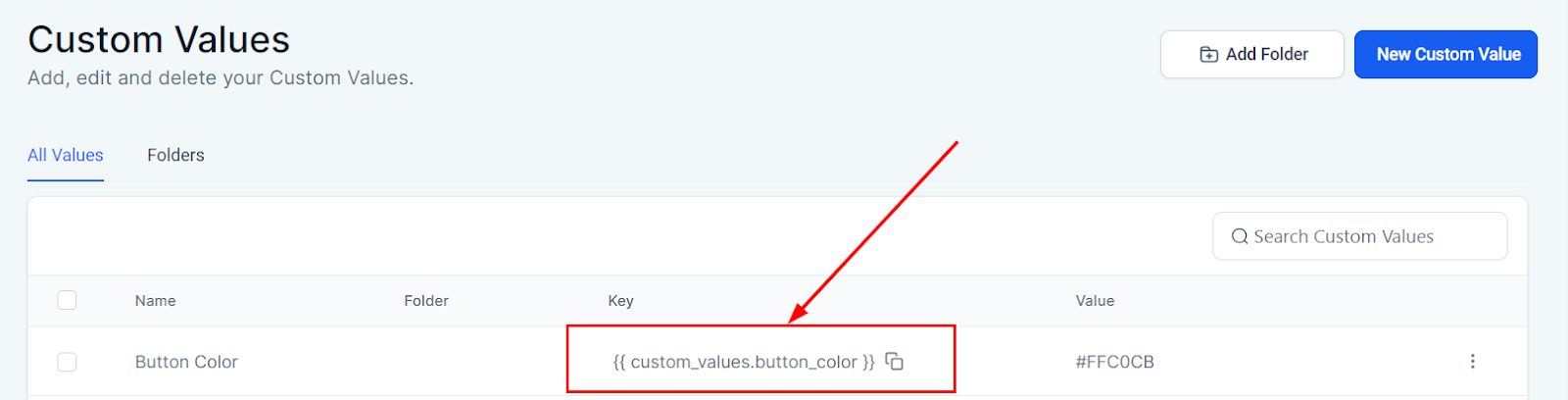 Create a new custom value for each color you'd like to incorporate. For instance, you can label one custom value as "button color" and assign it a hex code, such as #FFC0CB for pink.