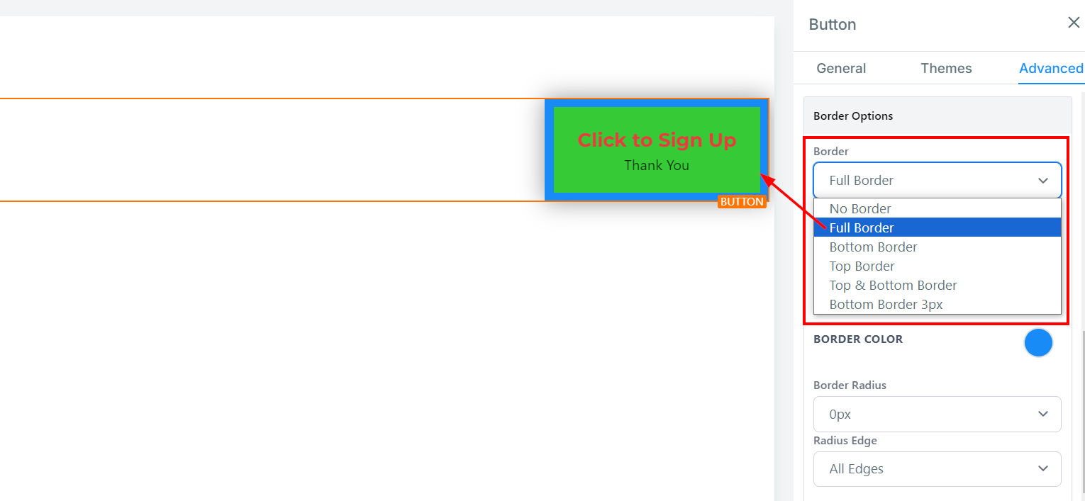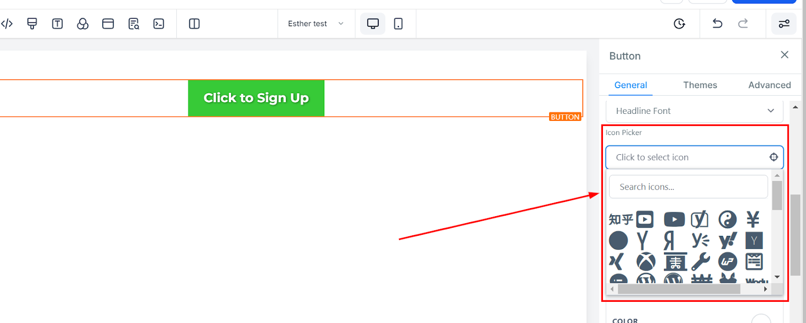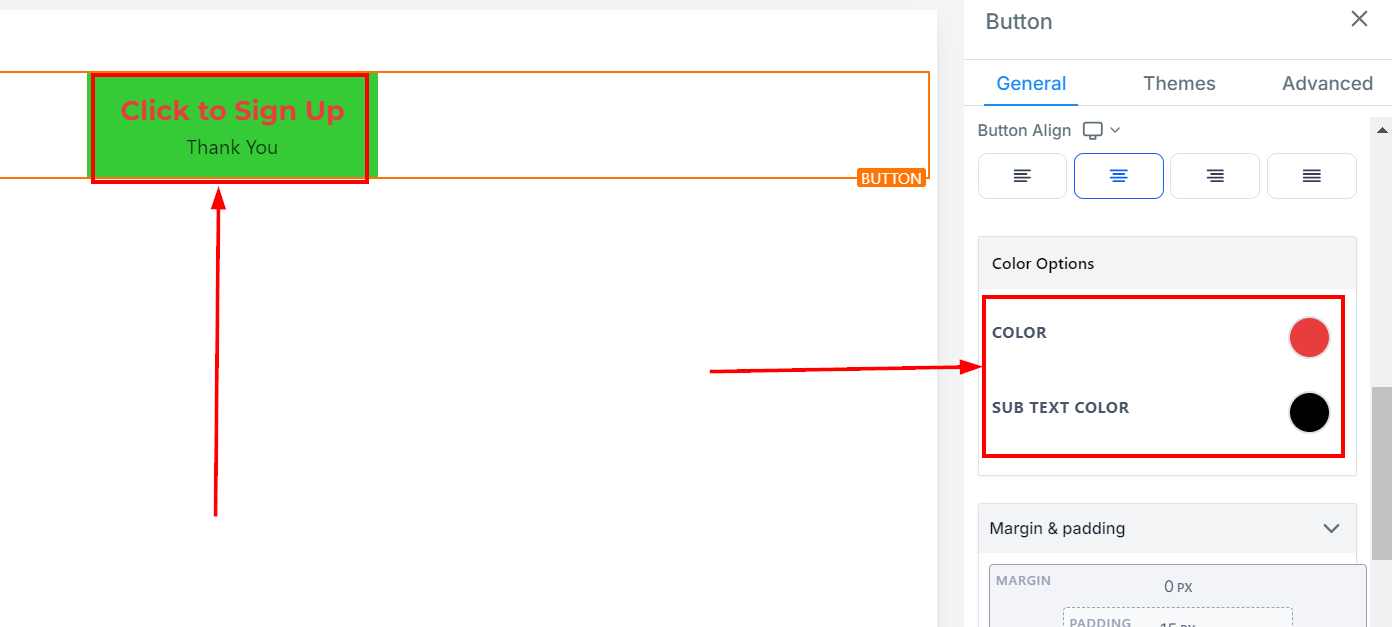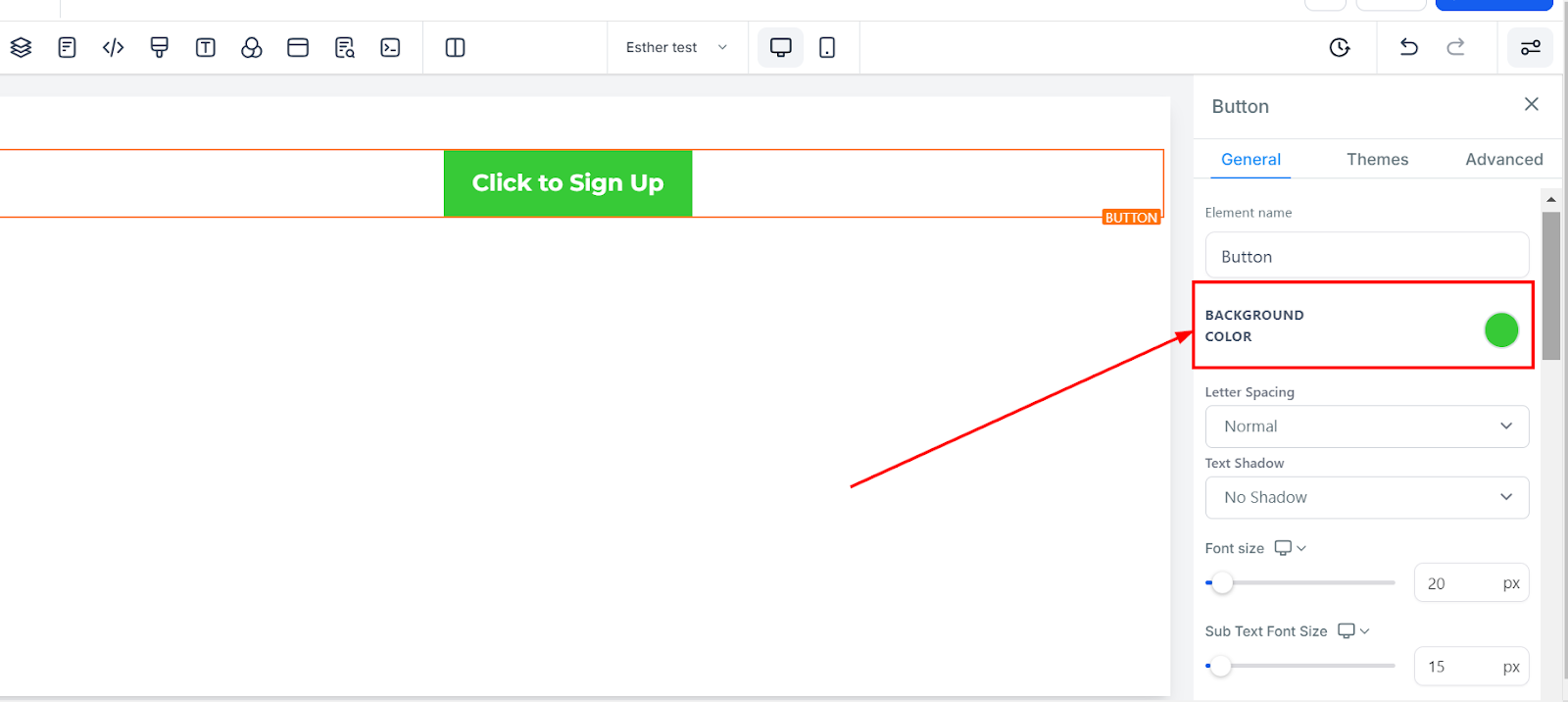 To change the background color of your button, click on the button and choose your desired shade. If your preferred color isn’t listed, enter a color code to apply a custom color.