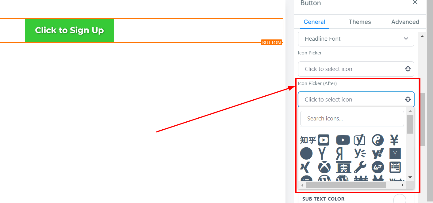Add an icon to the button by selecting one from the available choices or using the search bar to find the desired icon. The icon will appear before the button text.