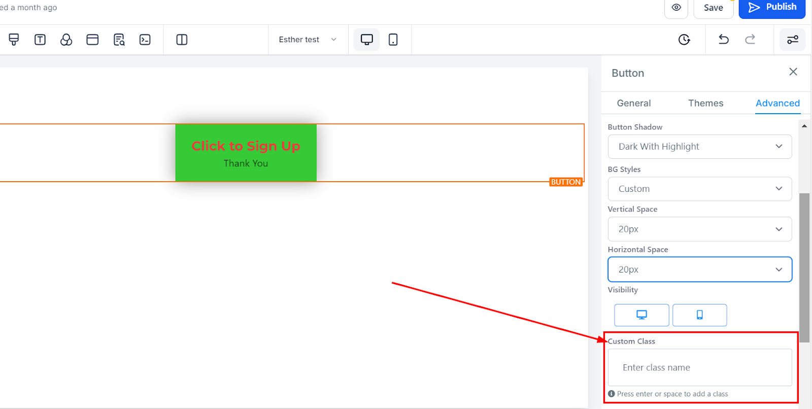 To apply a custom CSS class to the button, type the class name into the field.