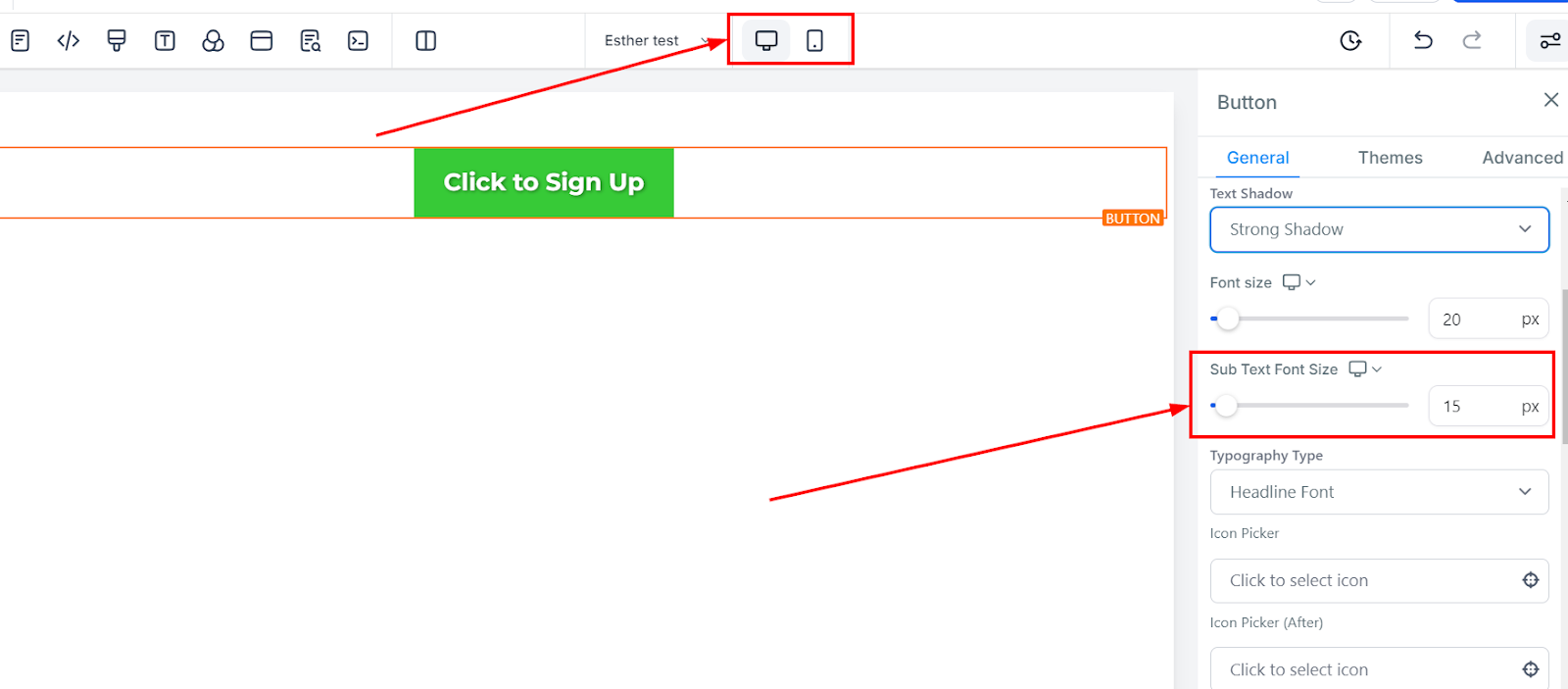 Similarly, you can modify the size of any sub-text added to the button for both mobile and desktop.