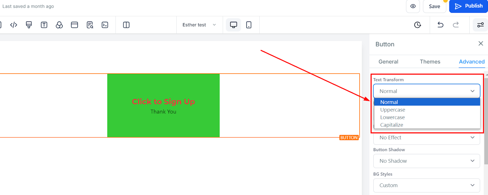 Change the button text’s format to uppercase, lowercase, or capitalized using the Text Transform option.