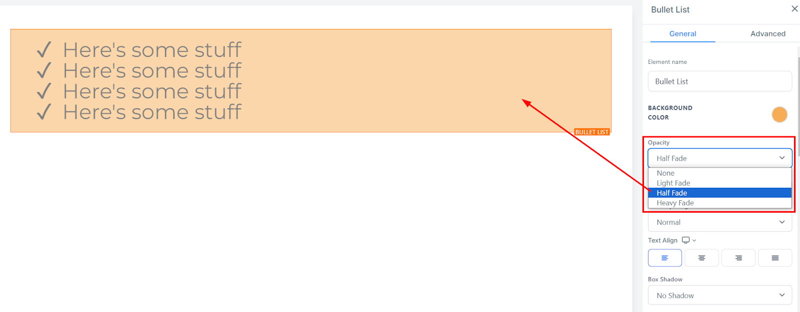 Control the transparency of your text or content with the opacity feature, which offers a range of fade levels. This helps enhance the visual appeal of your page by adding depth and texture.