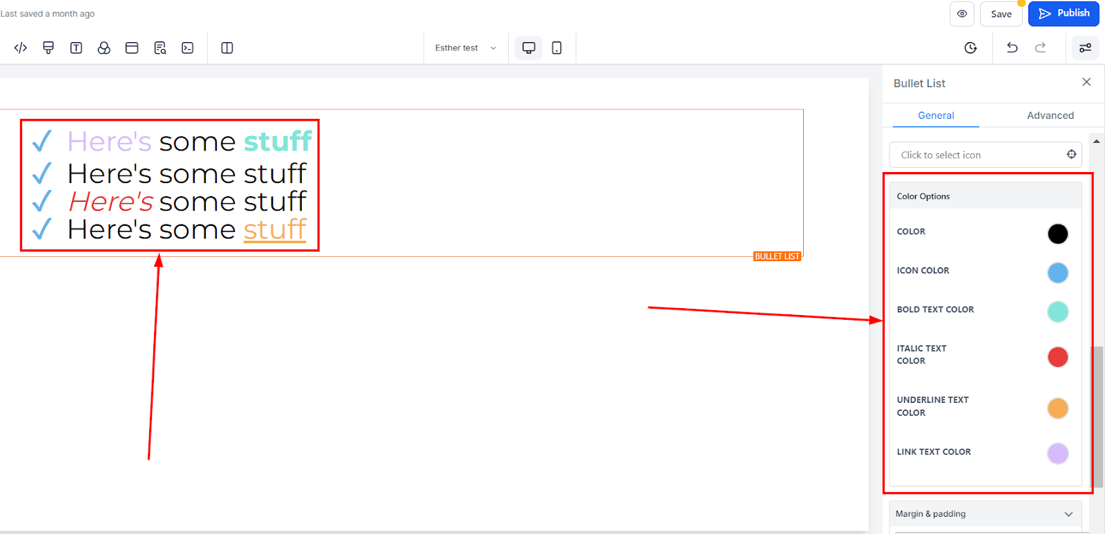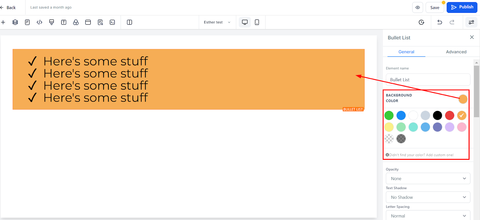 To change the background color of your bullet list, select the desired content and choose a color. You can also enter a custom color code if the available options don’t suit your needs.