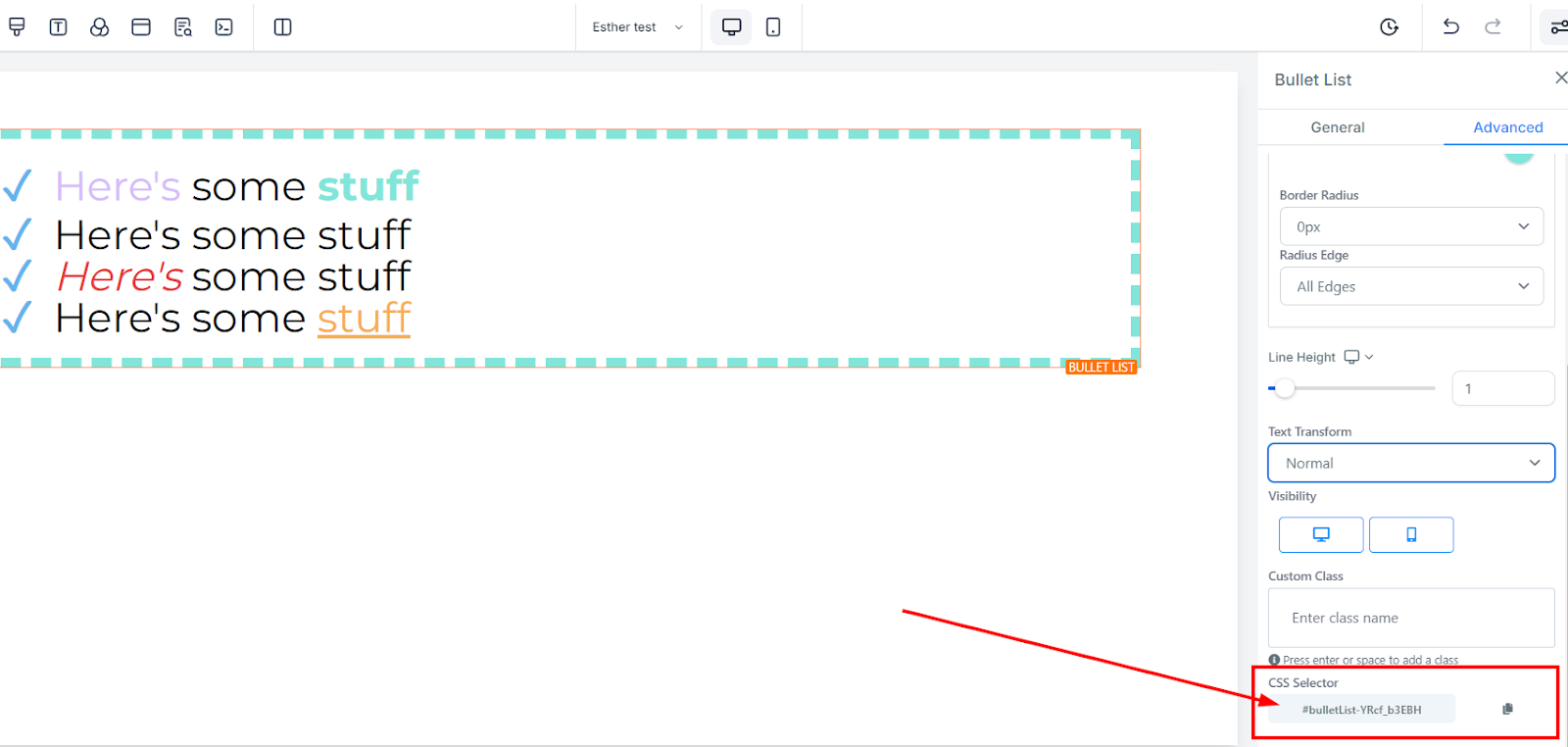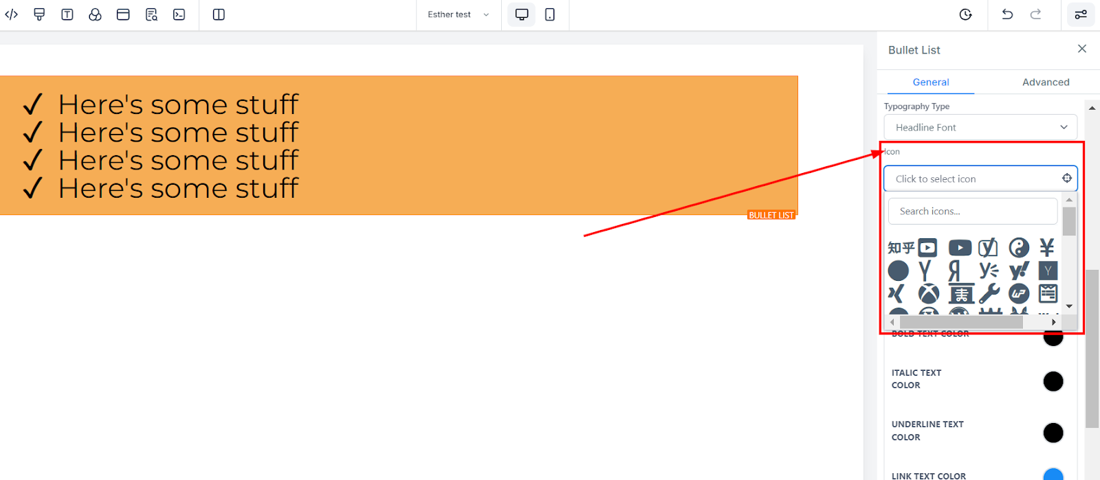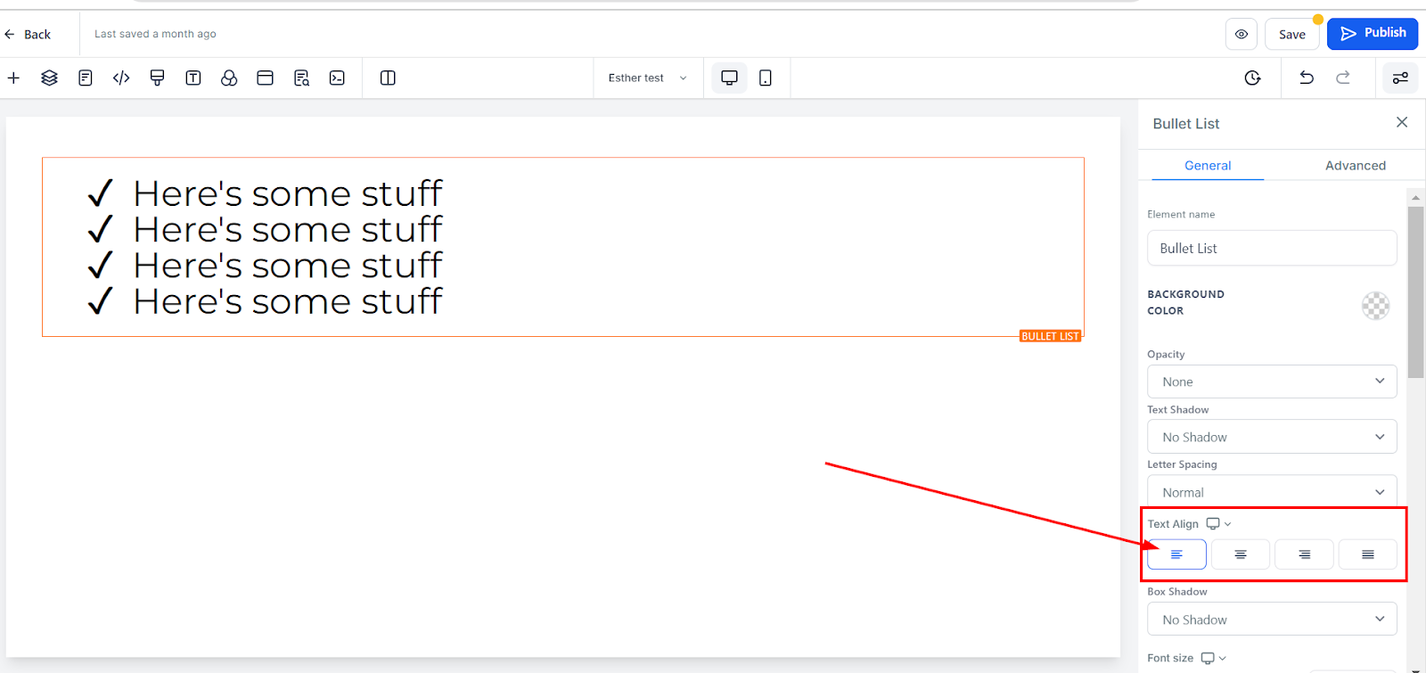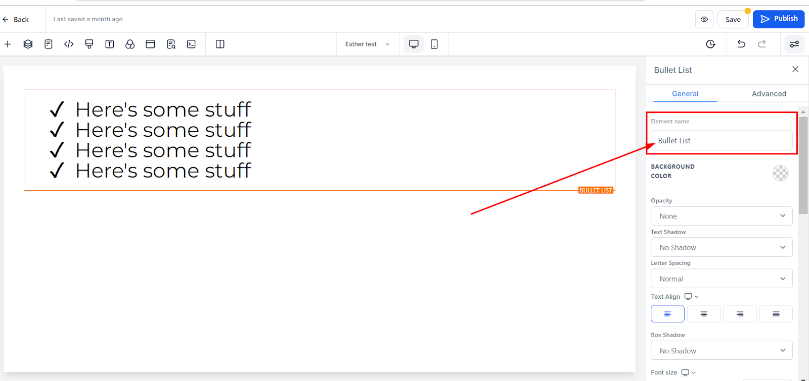 Adding bullet lists to your page is straightforward. Simply drag the bullet list element into the editor's workspace. Once placed, a dedicated editing toolbar will appear on the left side of the editor for easy customization.