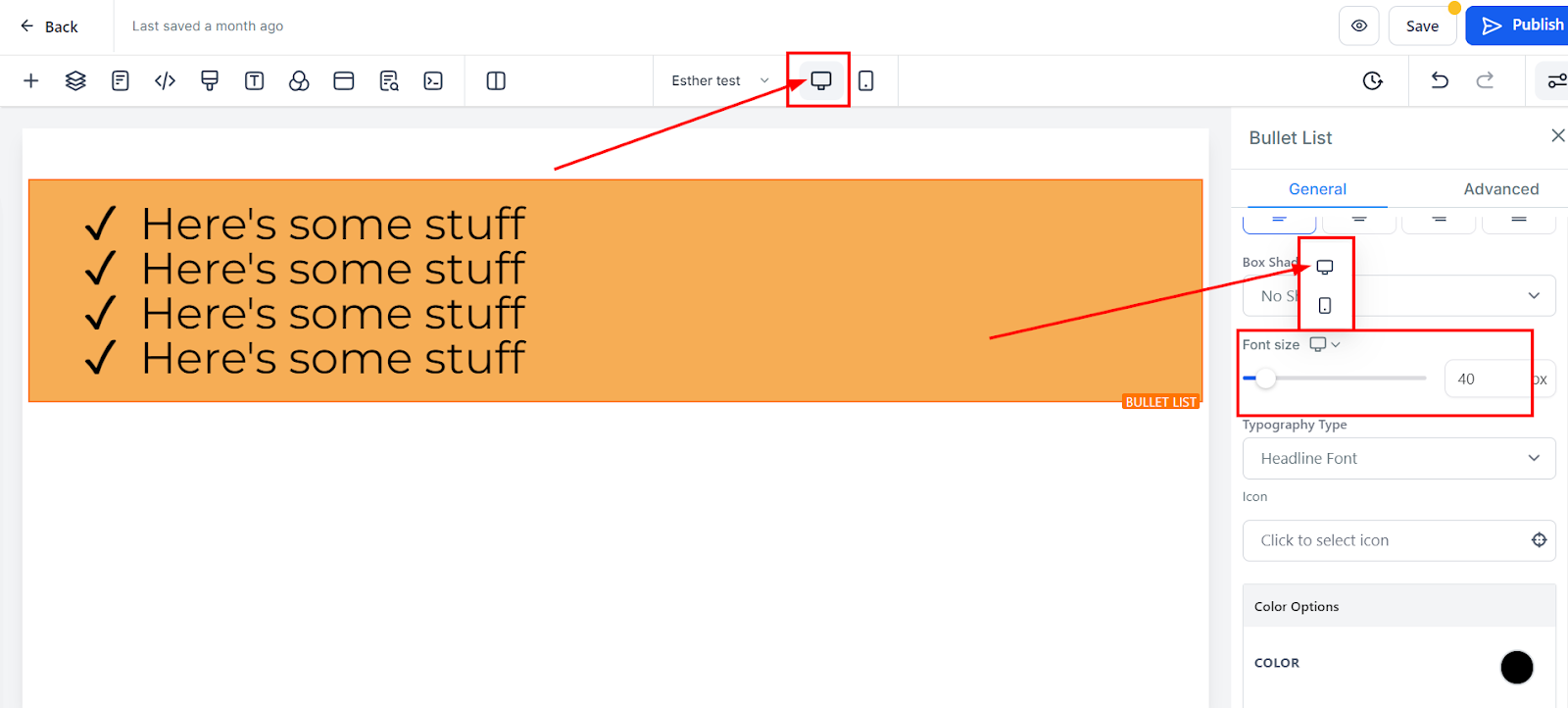 Change the font size for mobile and desktop views by using the size sliders for each element. You can toggle between views to preview the changes for different devices.
