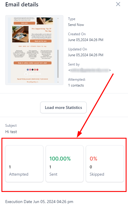 2. Scroll down to access a snapshot of your campaign's performance, including the total number of contacts targeted, emails successfully sent, and emails skipped.