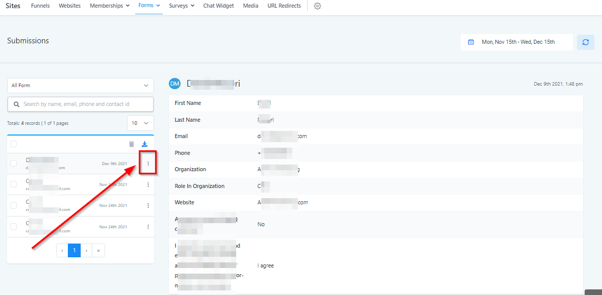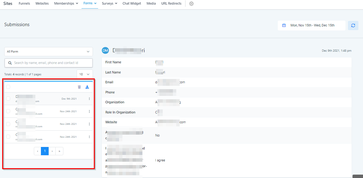 Each form submission will display essential details such as name, email, and the submission date. To select an individual or multiple submissions, click the checkboxes next to each entry.
