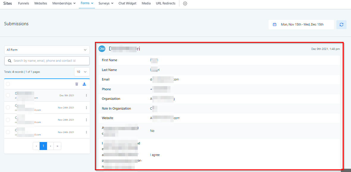 This area is where your CRM aggregates and organizes all form submissions. From here, you can review, download, or erase form data.