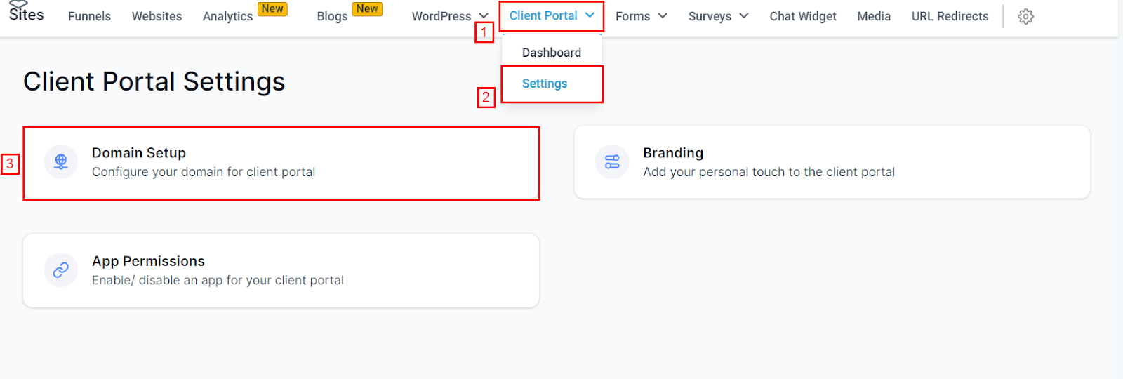 Begin by navigating through the left-hand sidebar to the "Sites" tab, then select "Client Portal" and proceed to the "Domain Setup" section.