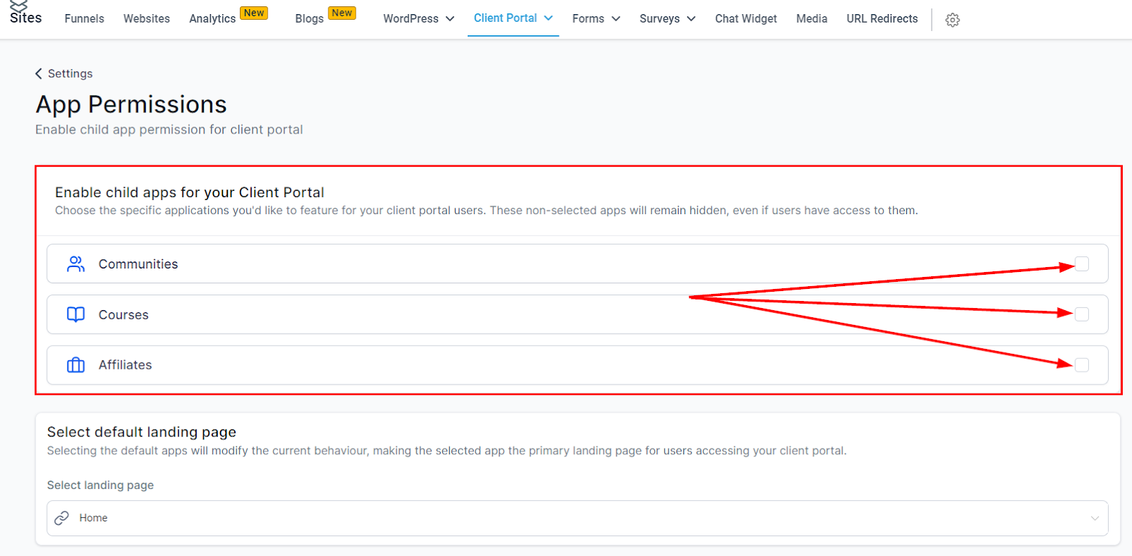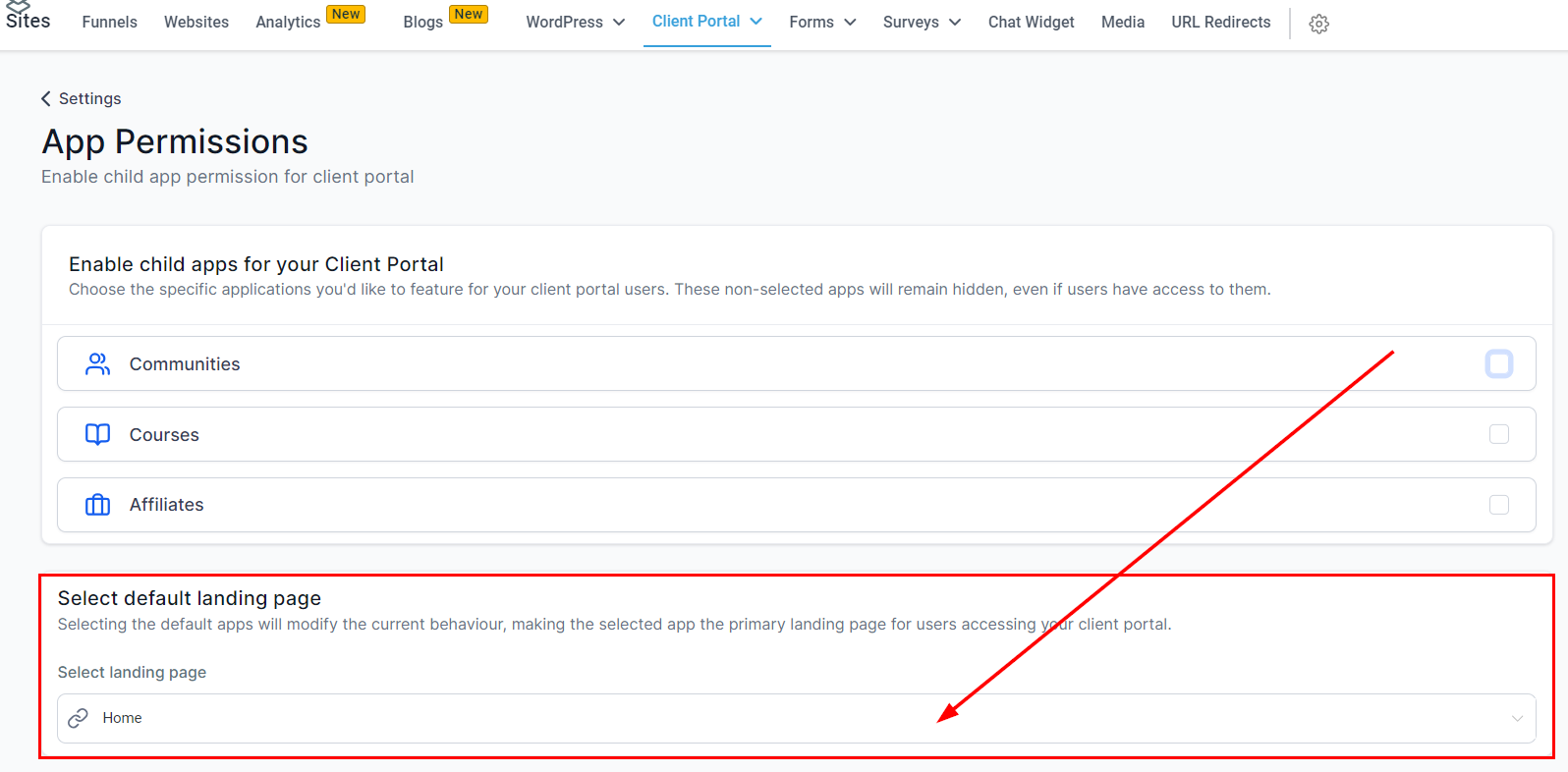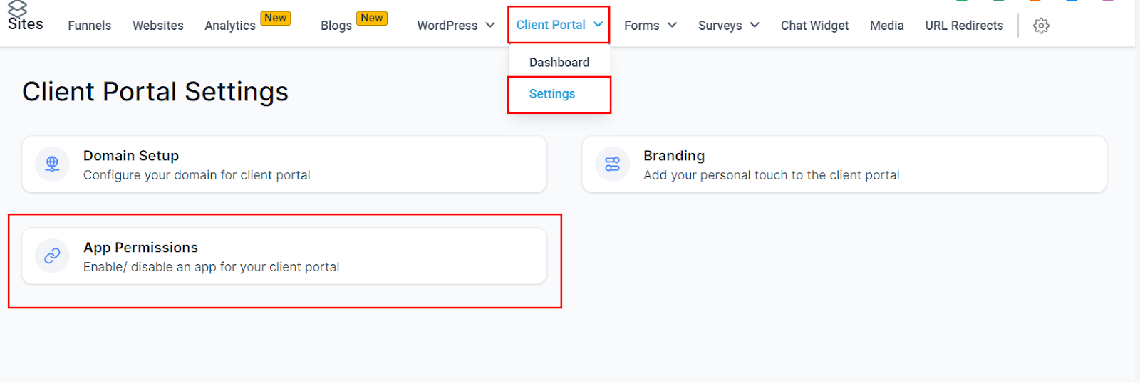 You can control which apps are available in your portal by configuring permissions. To do this, head to "App Permissions" in the settings.