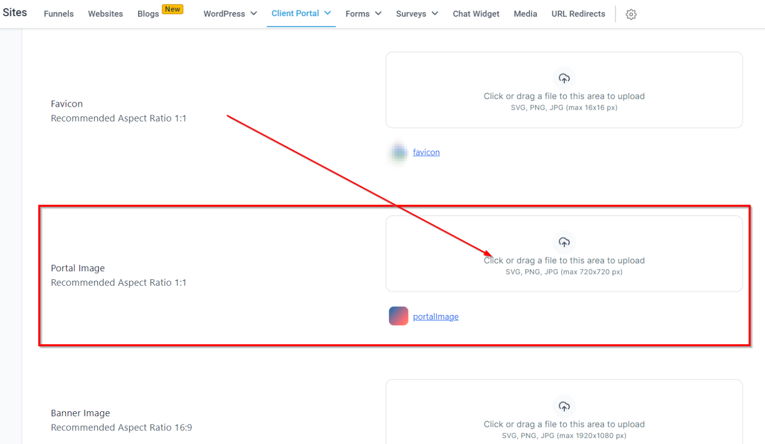 • Portal Image: Upload a square image (up to 720x720 pixels) to represent your brand.