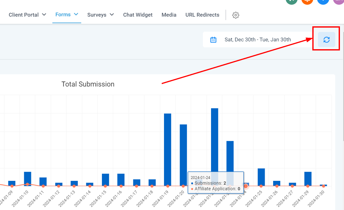 If you want to see the most up-to-date data, simply click the refresh icon located next to the date range selector. This will reload the form's submission information, ensuring you have the latest figures.