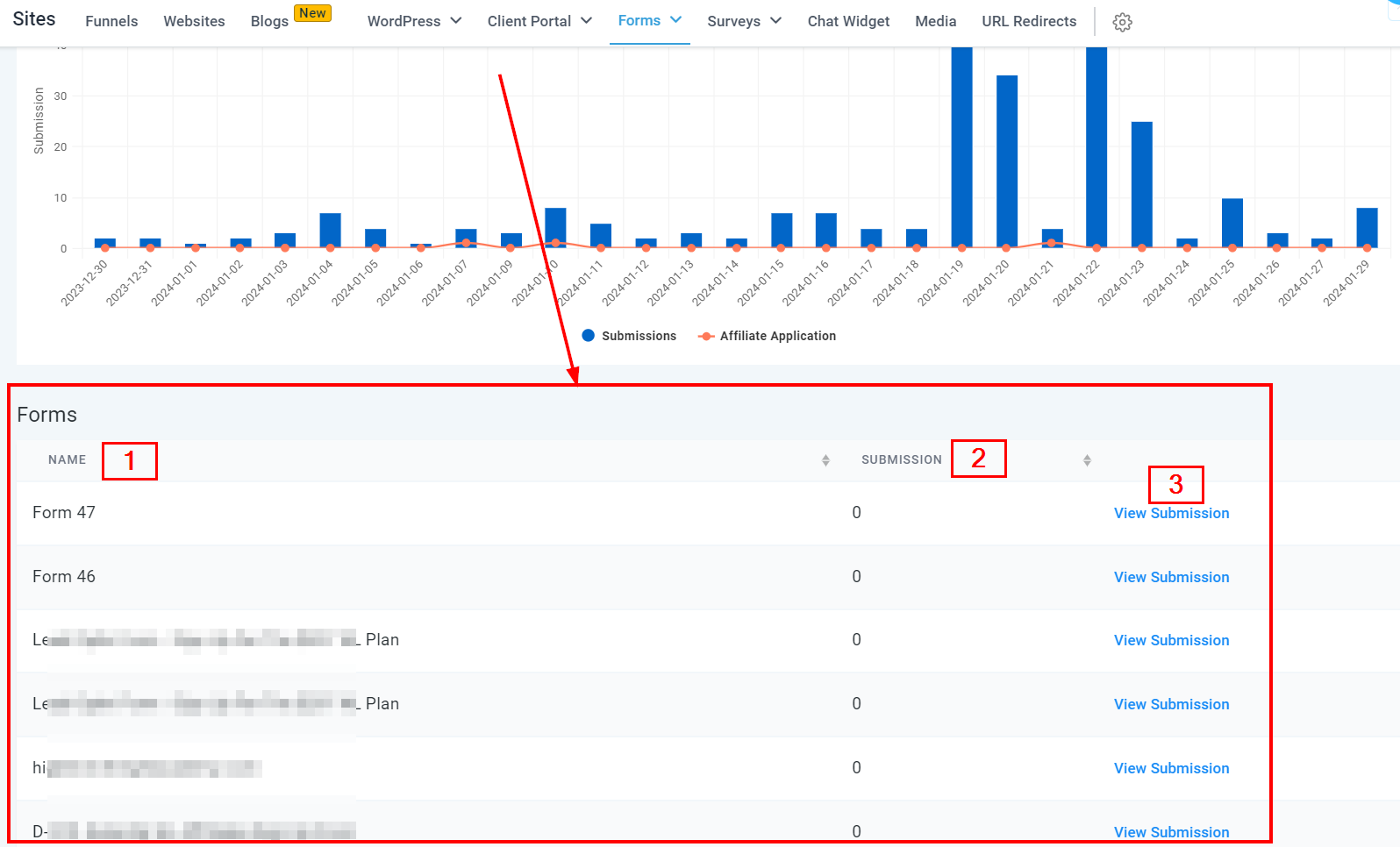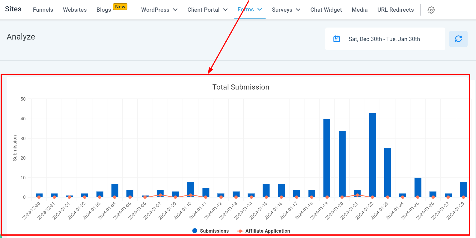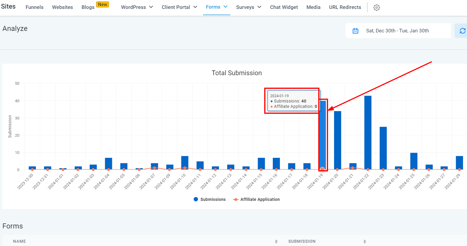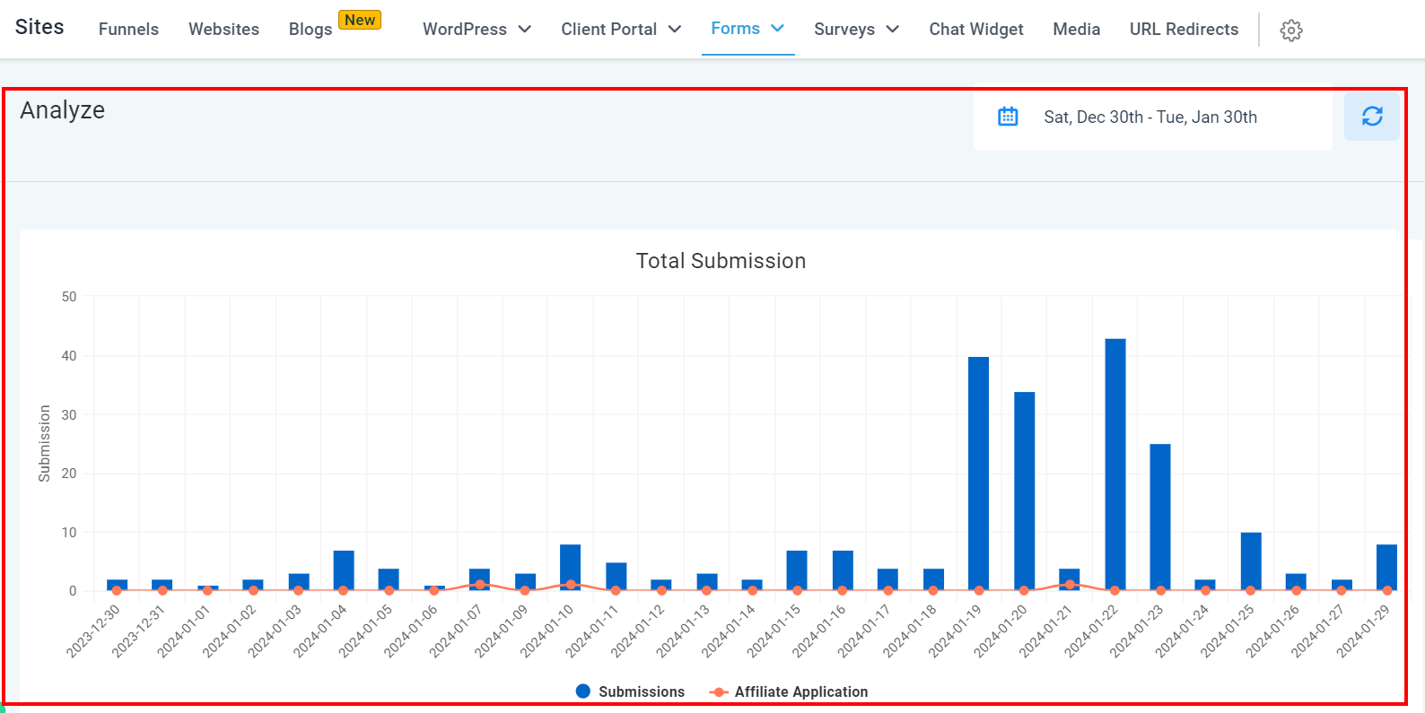 The Analyze section in the Form section of your CRM system helps you efficiently manage and track the statistics of each form submission and affiliate application. It compiles data from each form, providing you with a comprehensive daily report that includes submission numbers and affiliate applications.