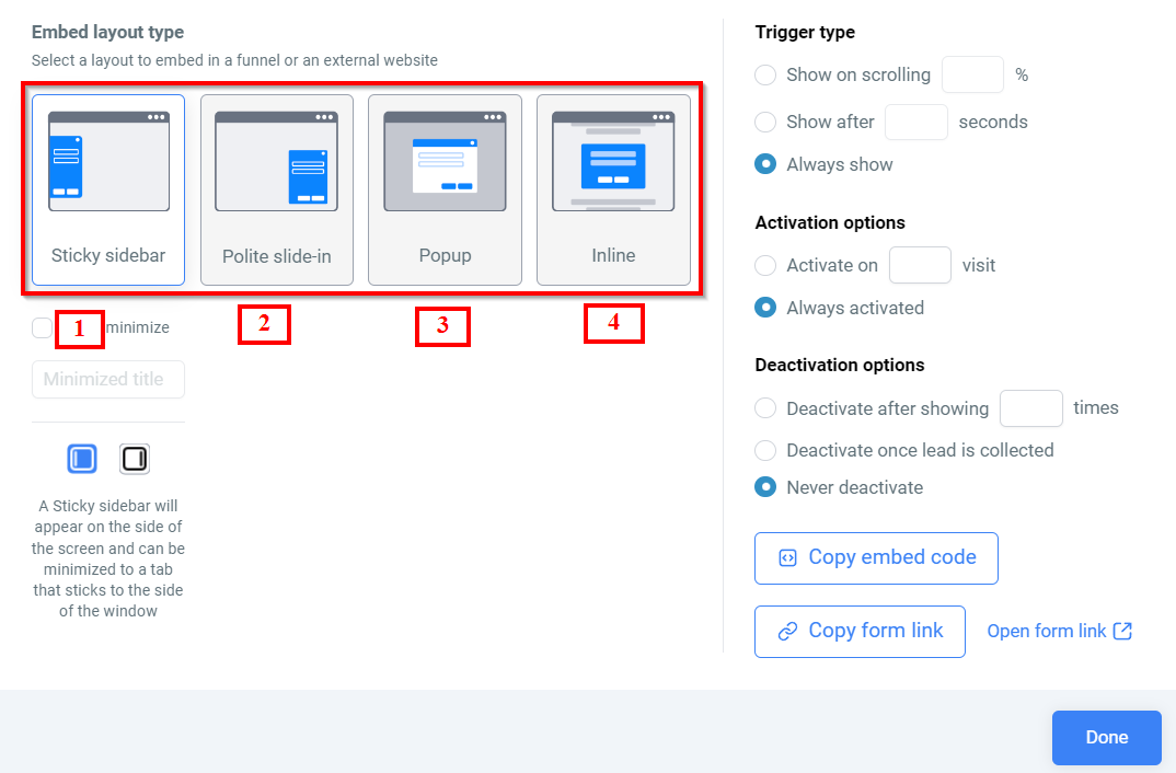 Once you click the integration tab, you’ll be prompted to select an Embed Layout Type. The available options include:
