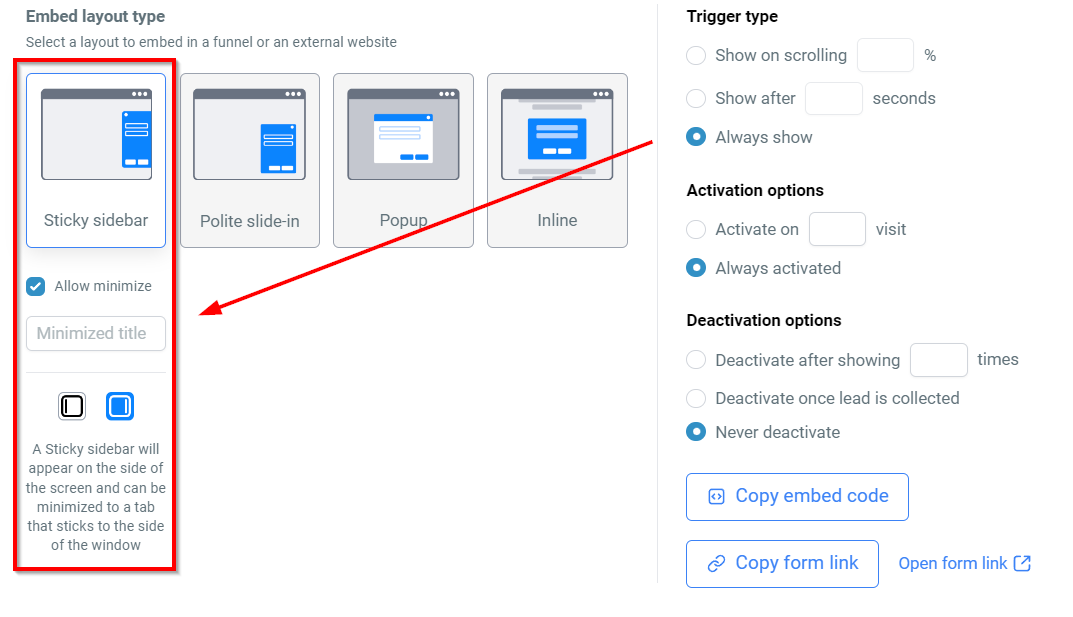 This layout places the form on either the right or left side of the screen. Users can minimize the sidebar if preferred, and you can customize its minimized title.