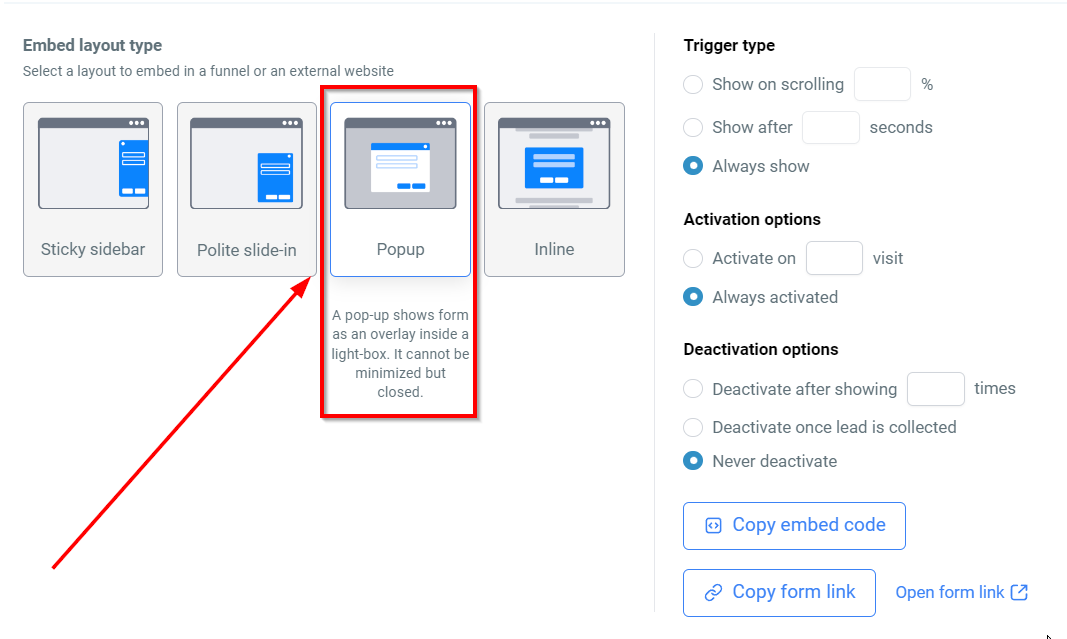 Clicking the “Copy Embed Code” button allows you to paste the form onto external web pages. If you're unsure about the code placement, it’s best to consult your web developer.