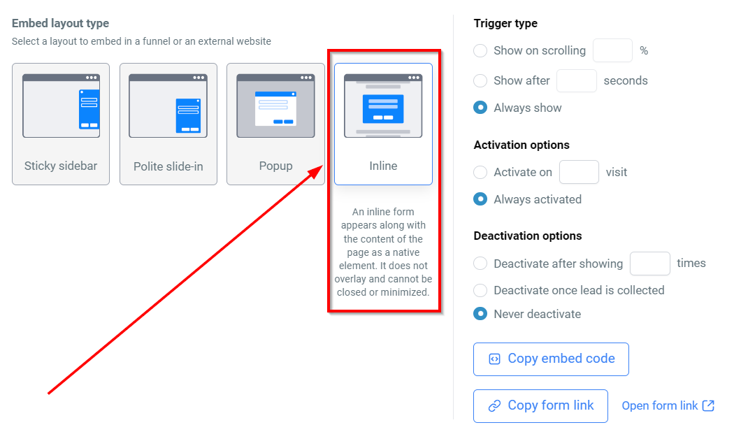 Inline forms blend with the page content and cannot be minimized or closed. Their elements are aligned, providing a seamless experience within the page layout.