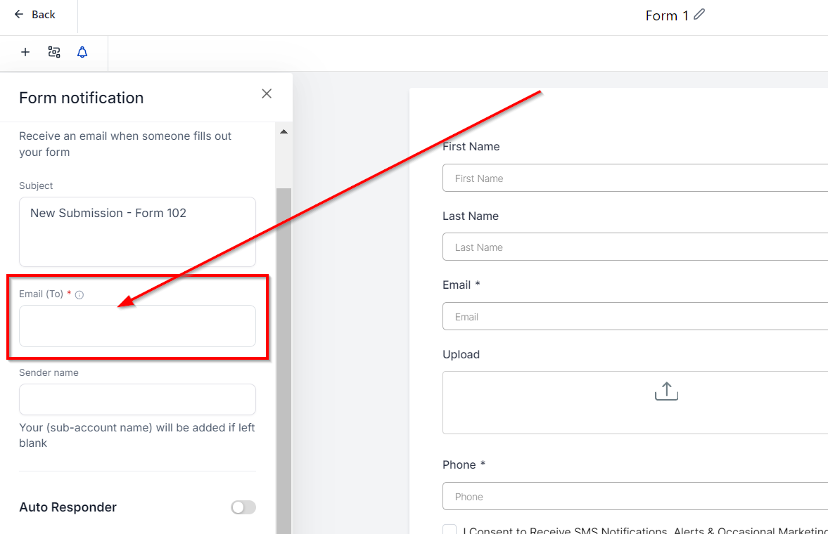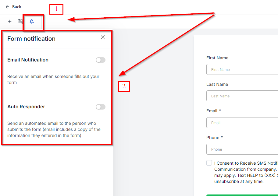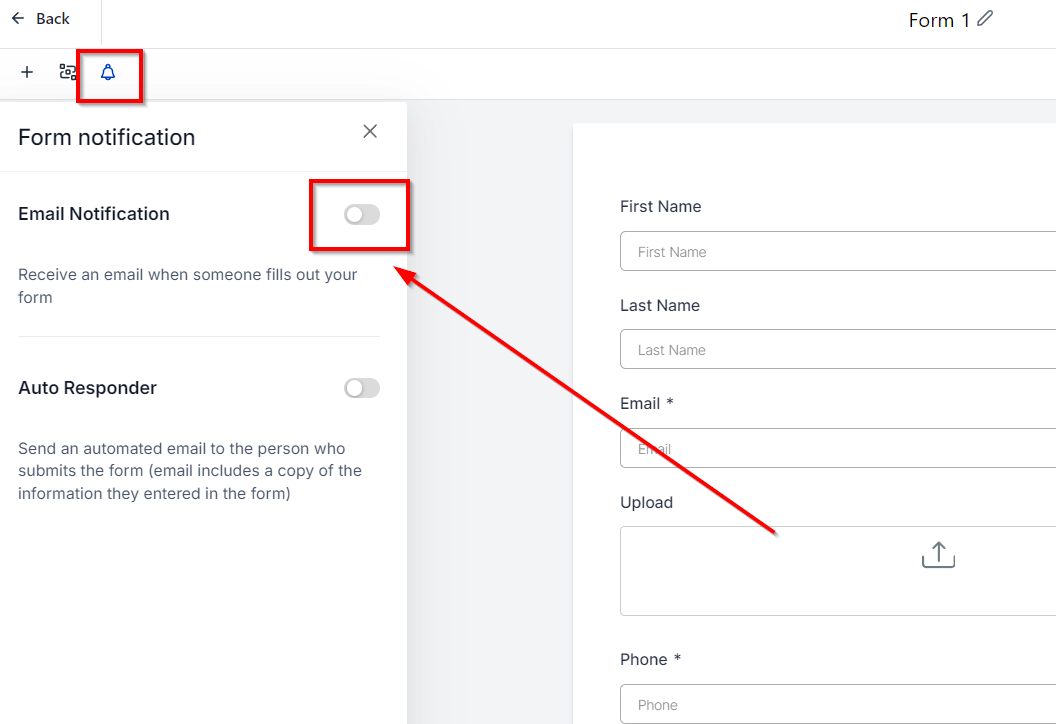 - In the form editor, click on the bell icon in the top toolbar to access the notification settings.