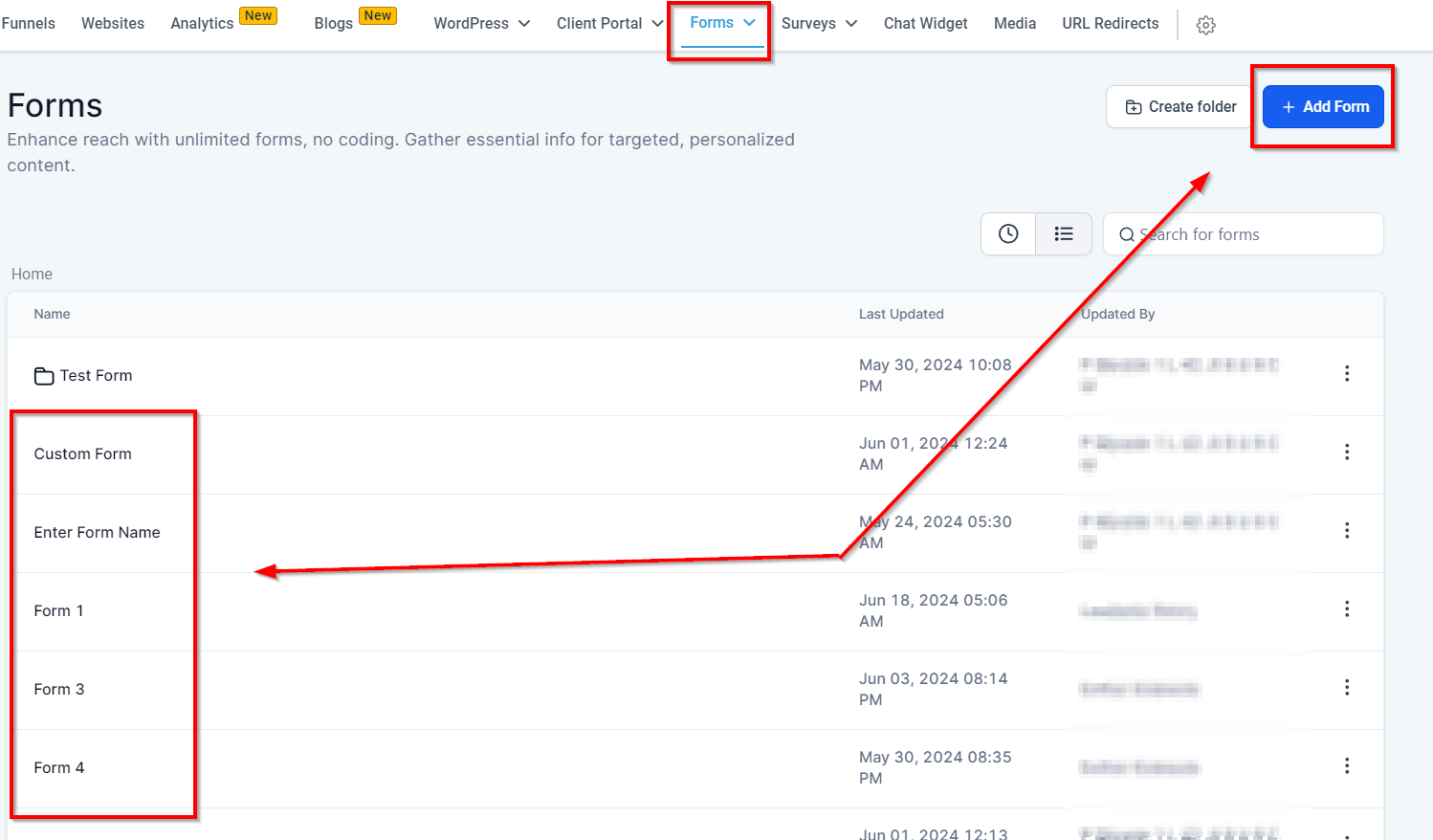 - To make a new form, click "Add Form." If you're modifying an existing one, select the form to edit it.