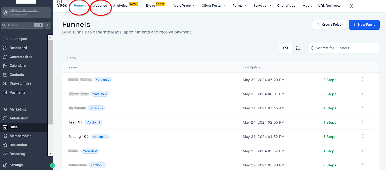 Inside the subaccount, locate and select the 'Sites' tab. This section allows you to manage both funnels and websites.