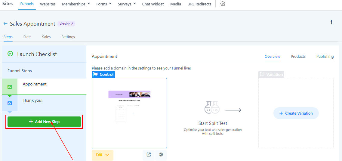 To add a new step to your funnel, click on the green Add New Step button. This allows you to further customize and expand your funnel as needed to support your marketing efforts.