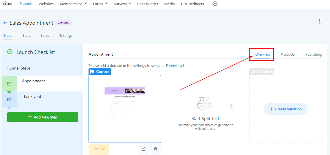 The Overview tab provides access to every funnel step for editing purposes. You can fine-tune each step to ensure it aligns with your marketing goals and provides the best user experience.