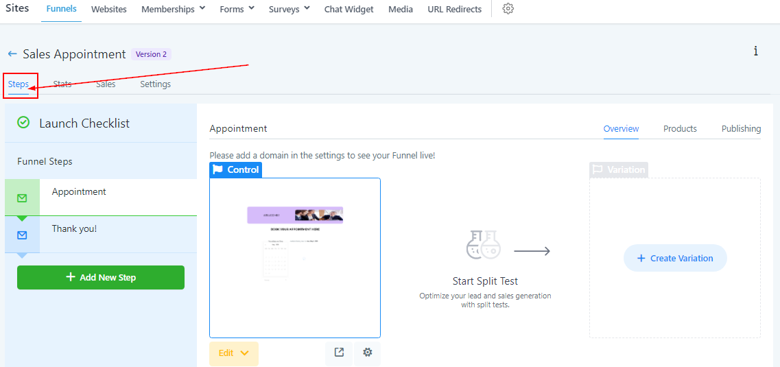 Funnels are structured in steps, guiding customers through actions like making an appointment. In this section, you can create new funnel pages, reorder your steps, and add products to your funnel. This setup ensures a smooth journey for your customers, from start to finish.