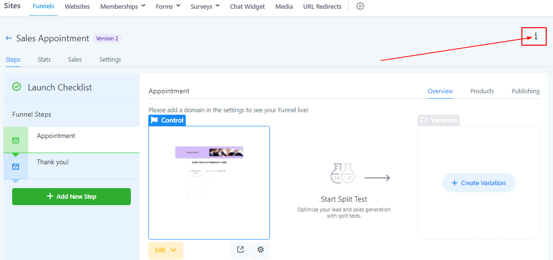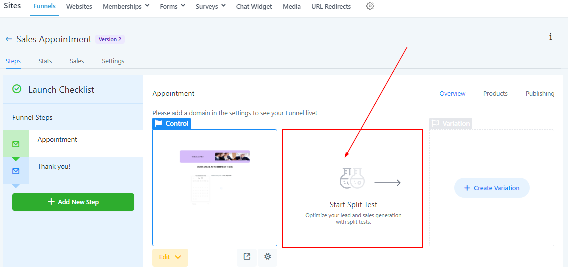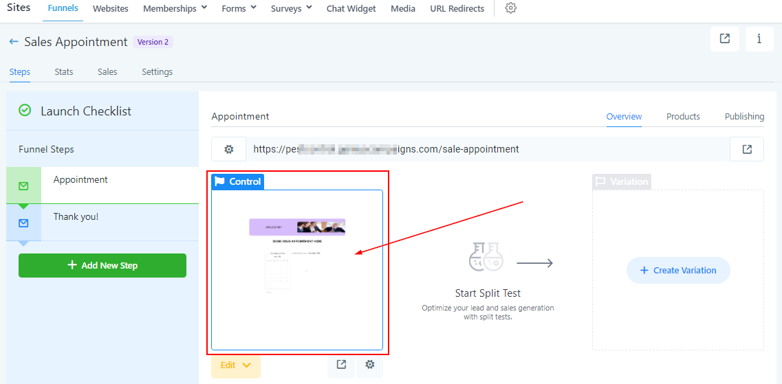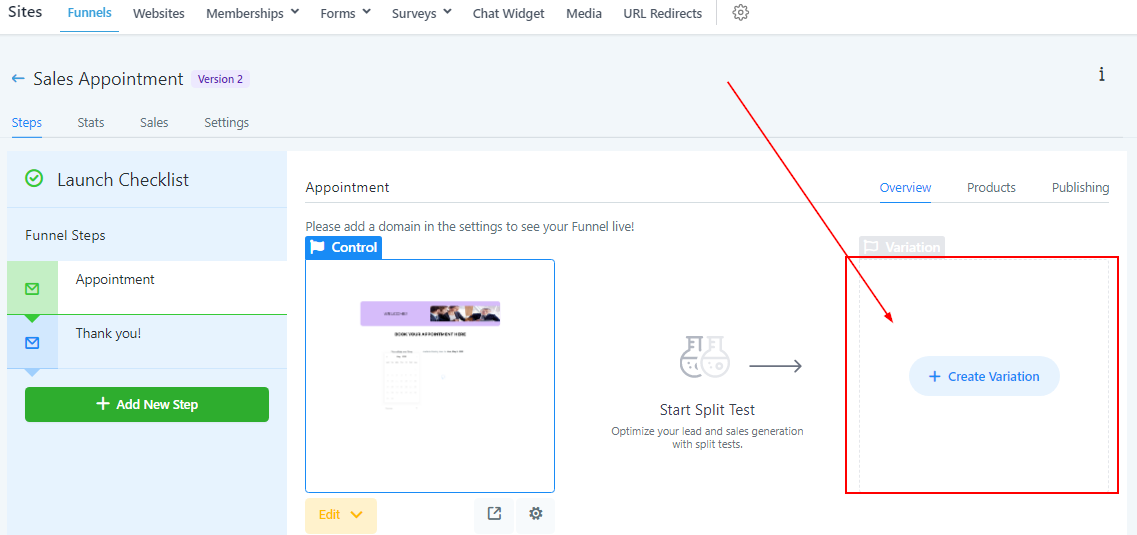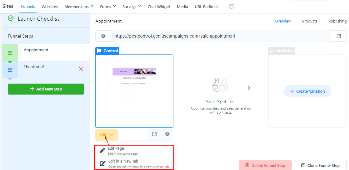 To create a split test variation, click the Create Variation button located on the right-hand side. This allows you to develop alternative versions of a funnel step and measure their effectiveness against the original.