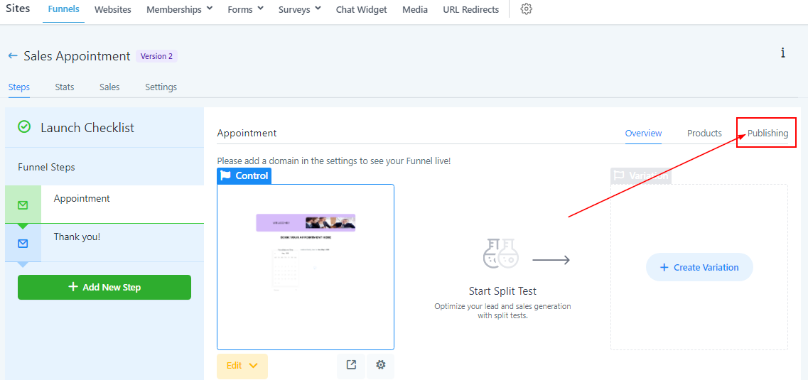 In the Publishing tab, you can edit the funnel step name and its URL path. Access to the Publishing tab can be found through several buttons across the interface, making adjustments to funnel steps simple and intuitive.
