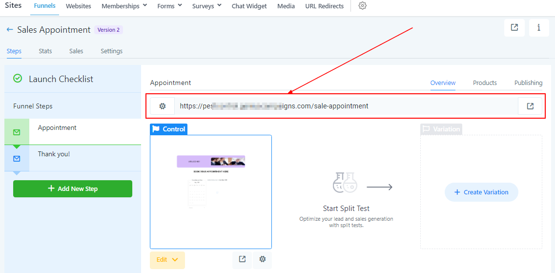 The URL path you've assigned will lead users to the online location of the funnel step. The Funnel Page URL settings also include a button that redirects you to the Publishing tab for further edits.