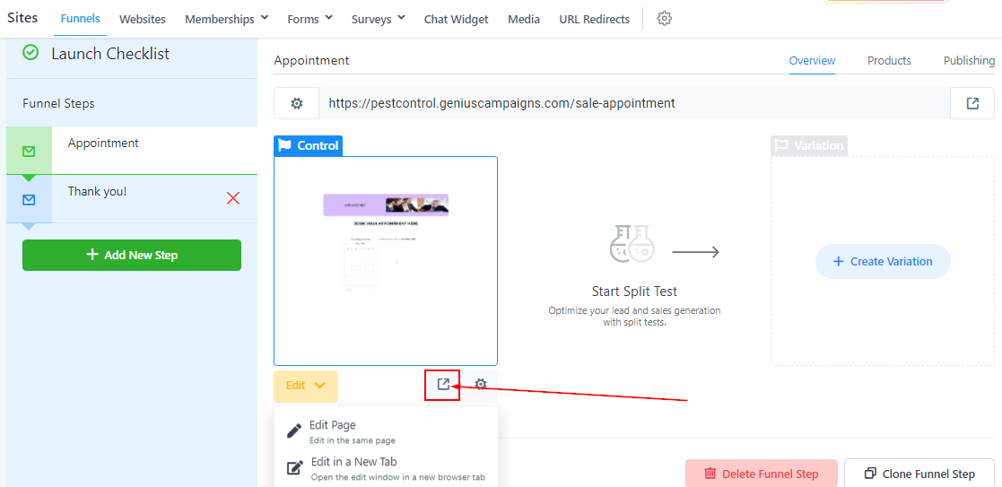 Click the edit button to begin building or editing your funnel steps. You can choose to edit directly on the same page or in a new browser tab using the provided webpage builder, which offers all the tools needed to customize your funnel.