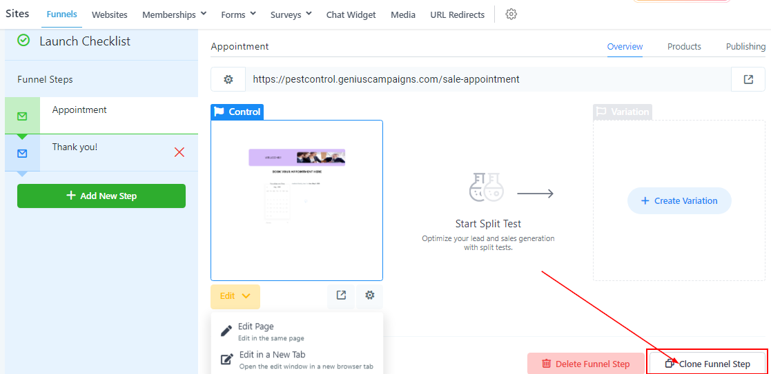 You can clone funnel steps to streamline your process. Just click the Clone Funnel Step button, and select where you want to clone it. This feature saves time and helps maintain consistency across funnels.