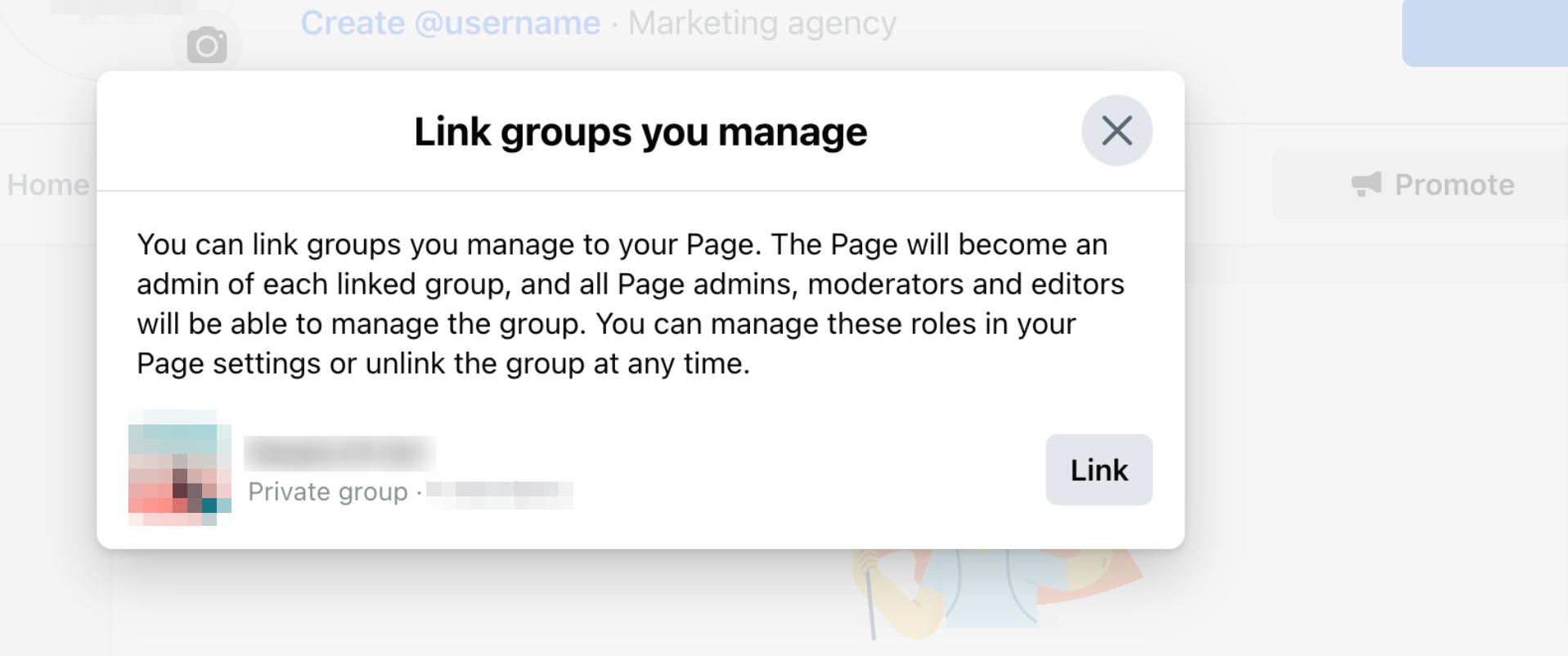 5. Confirm the Link: Click the "Link" button to finalize the connection. Note that you need to be an admin for both the Group and the Page you are linking.