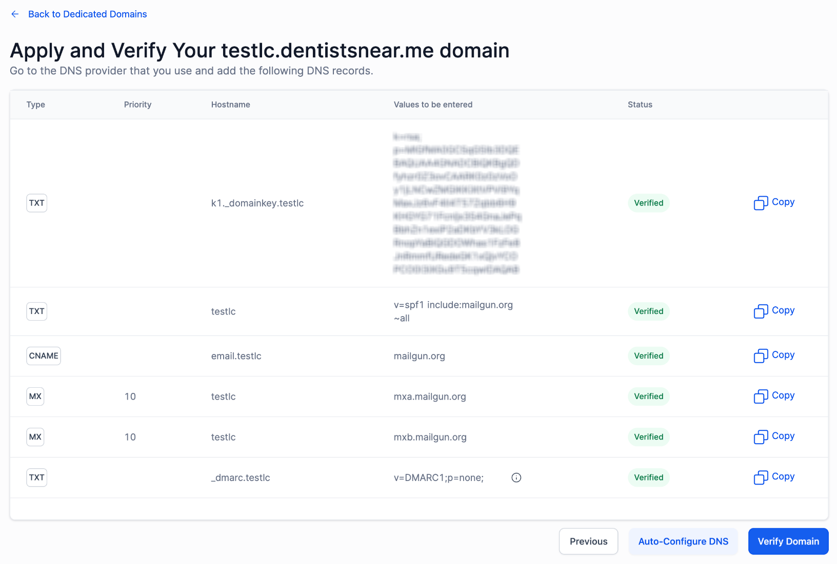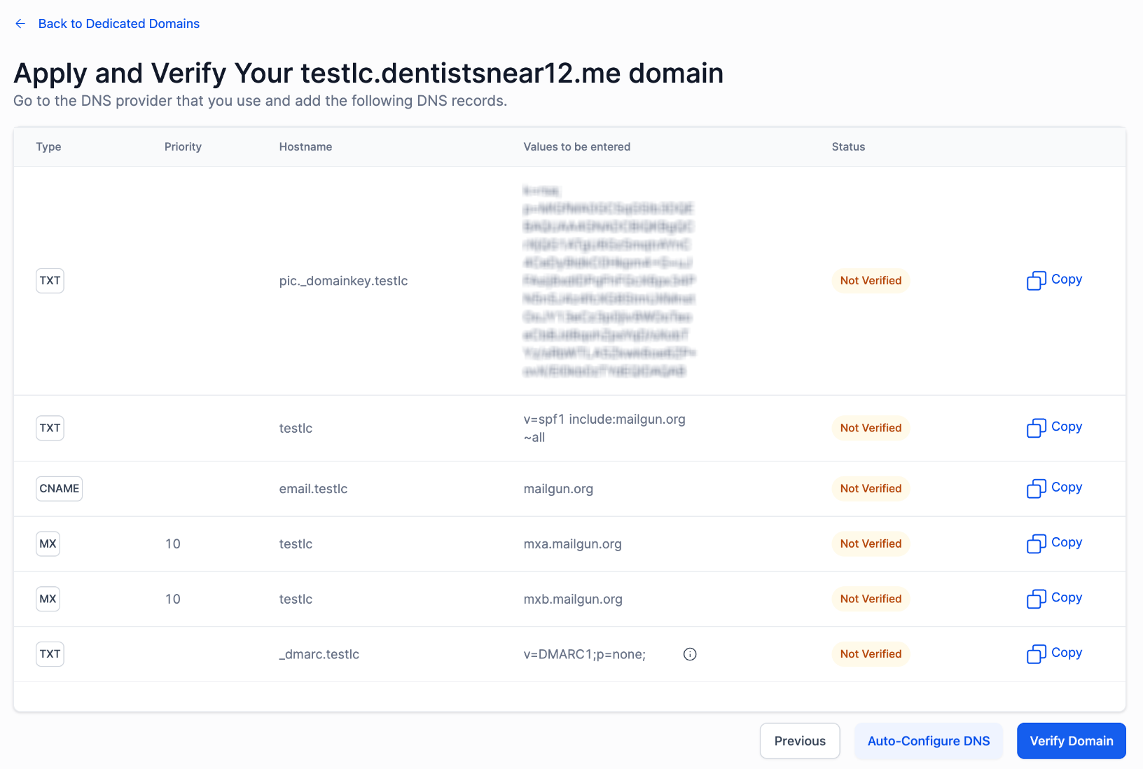 Note: The "Configure Domain" option may not be compatible with all DNS providers. If the system is unable to identify your provider, the records will be shown in a modal window. Click here to manually add the DNS records.