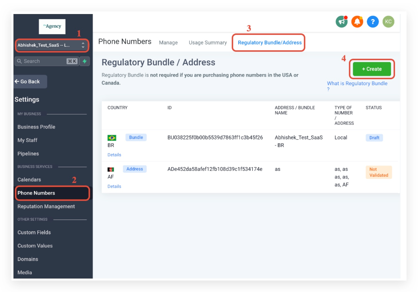 Regulatory Bundle/Address in the Phone Numbers Page at your account level (only visible to accounts who are on LC Phone), this will be visible to the platform and your account admins.