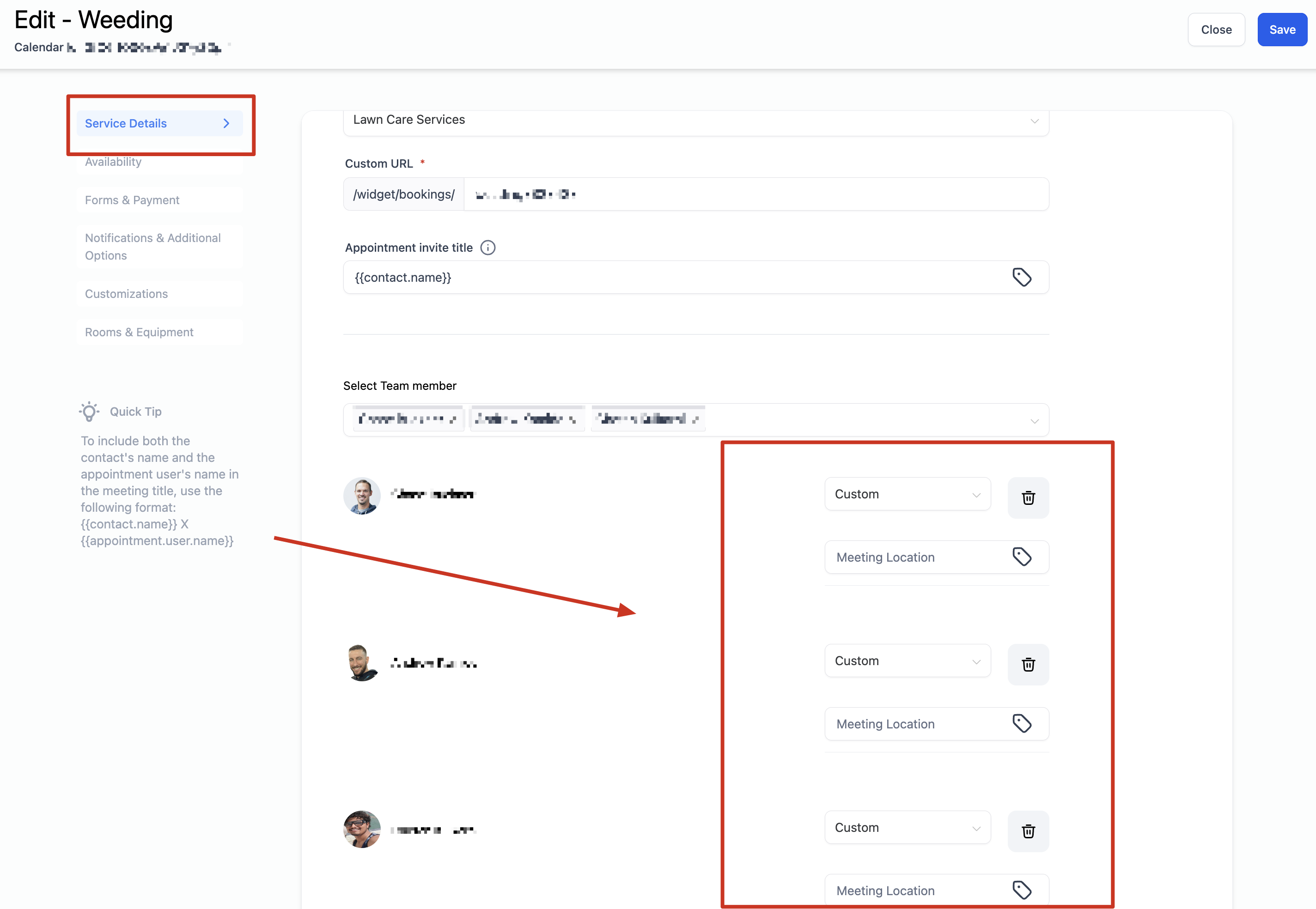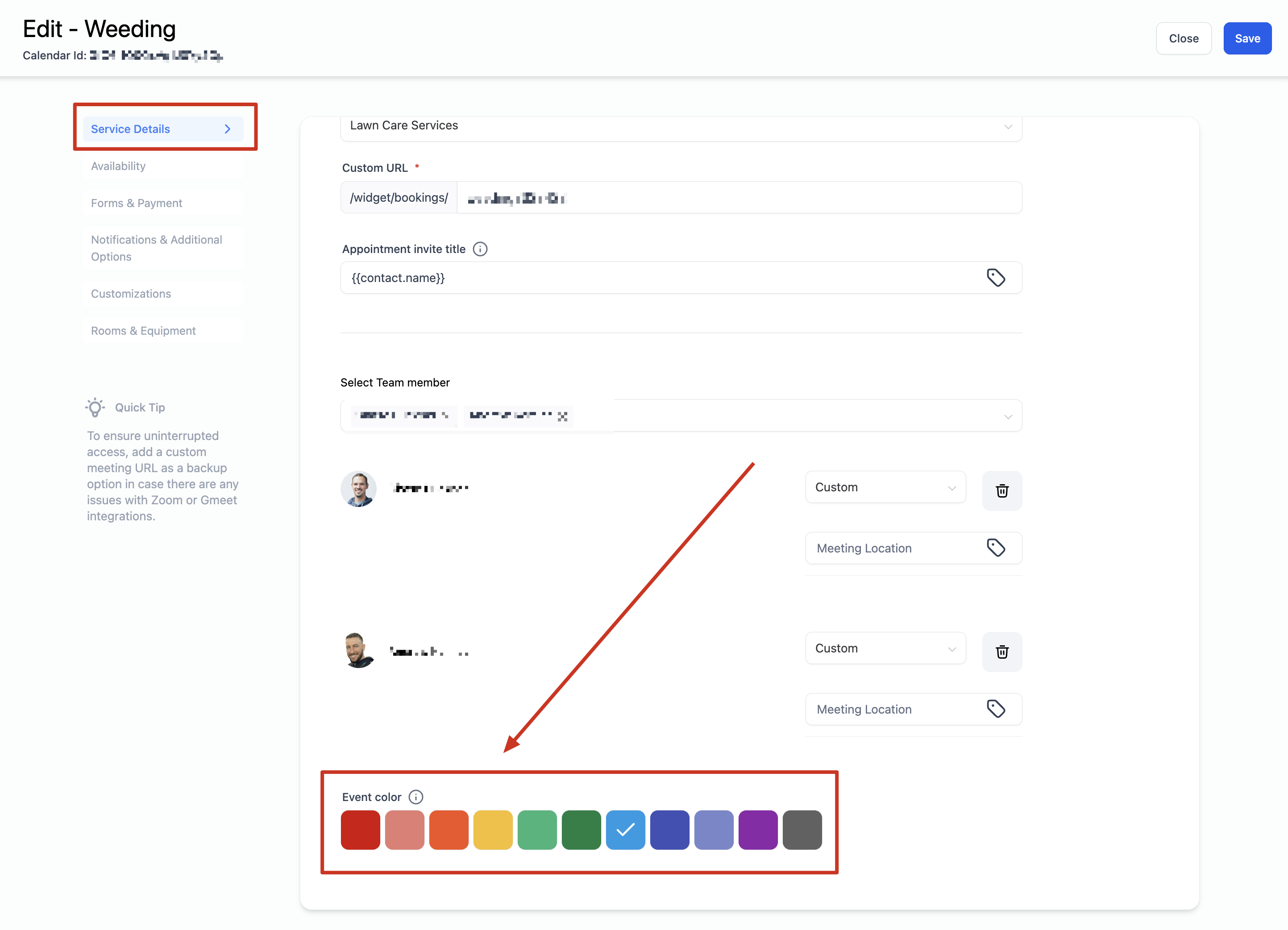 Staff Assignment and Location: Select the staff members who will be assigned to the service you're creating the calendar for. Once staff members are selected for a service calendar, you can configure their preferred meeting location from the advanced settings.