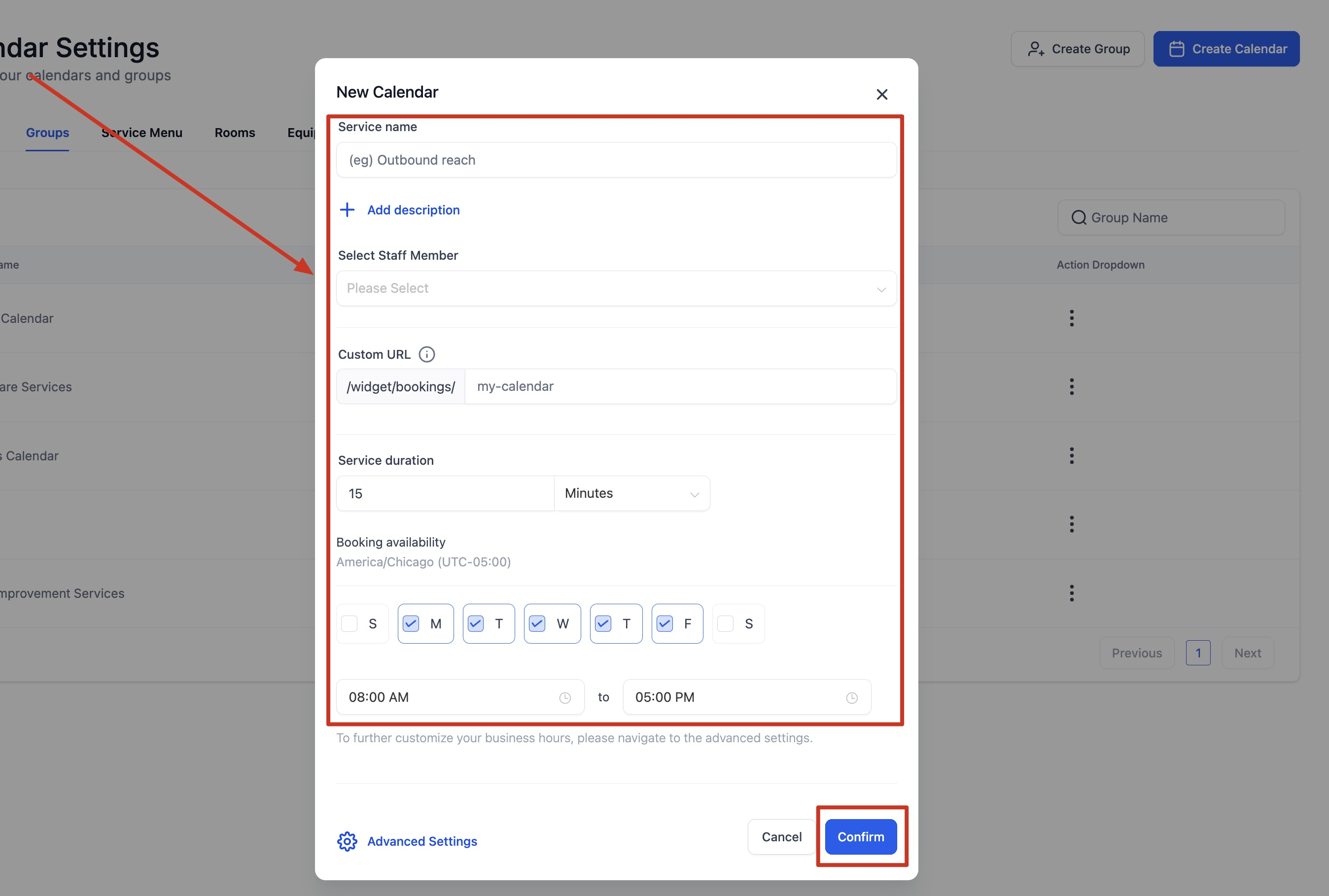 You can customize your service calendar further with Advanced Options. Simply click on the Advanced Settings Button.