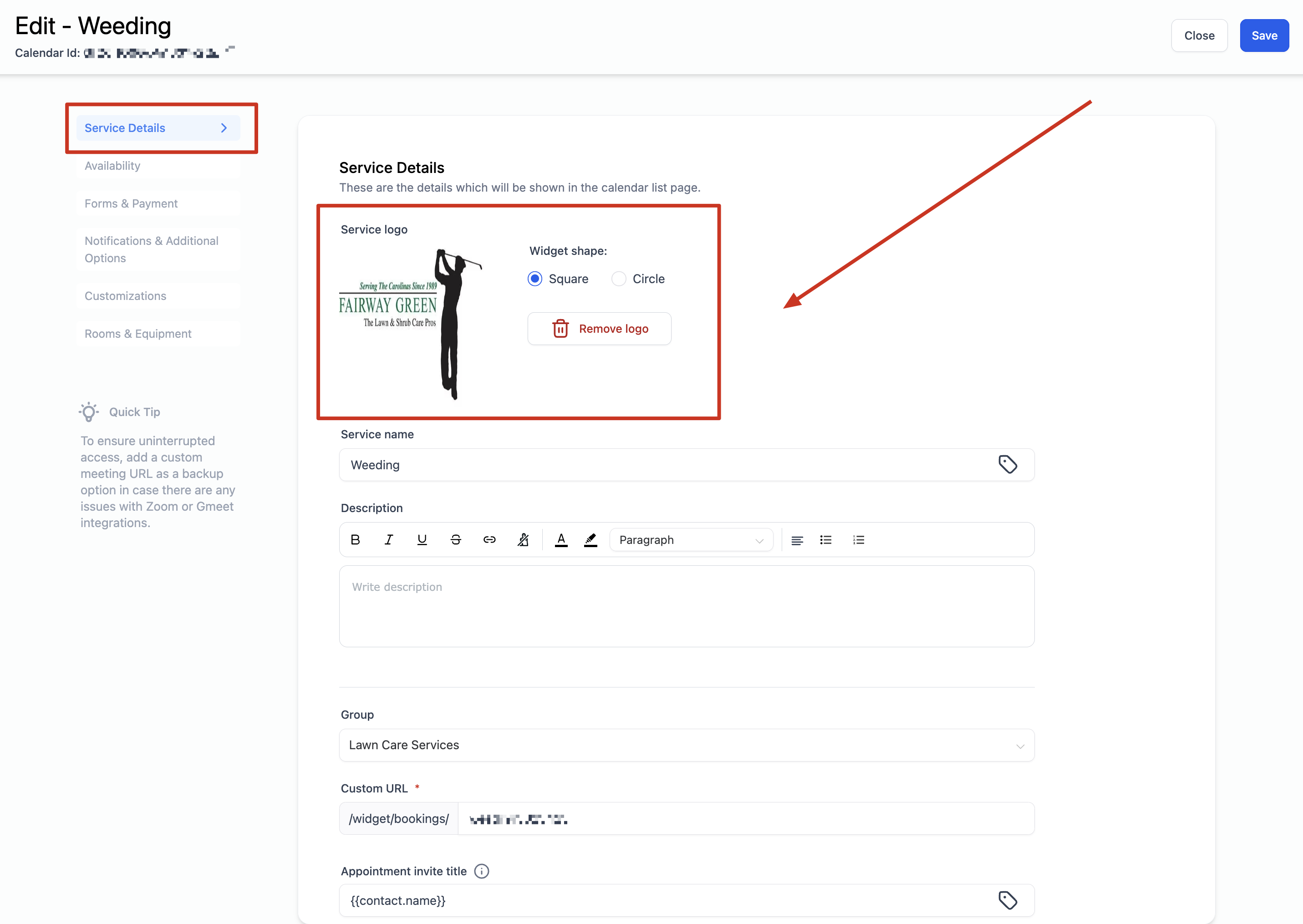 Upload your Service Logo - This is the image that will appear on the Appointment Booking Widget for your Service Calendar.