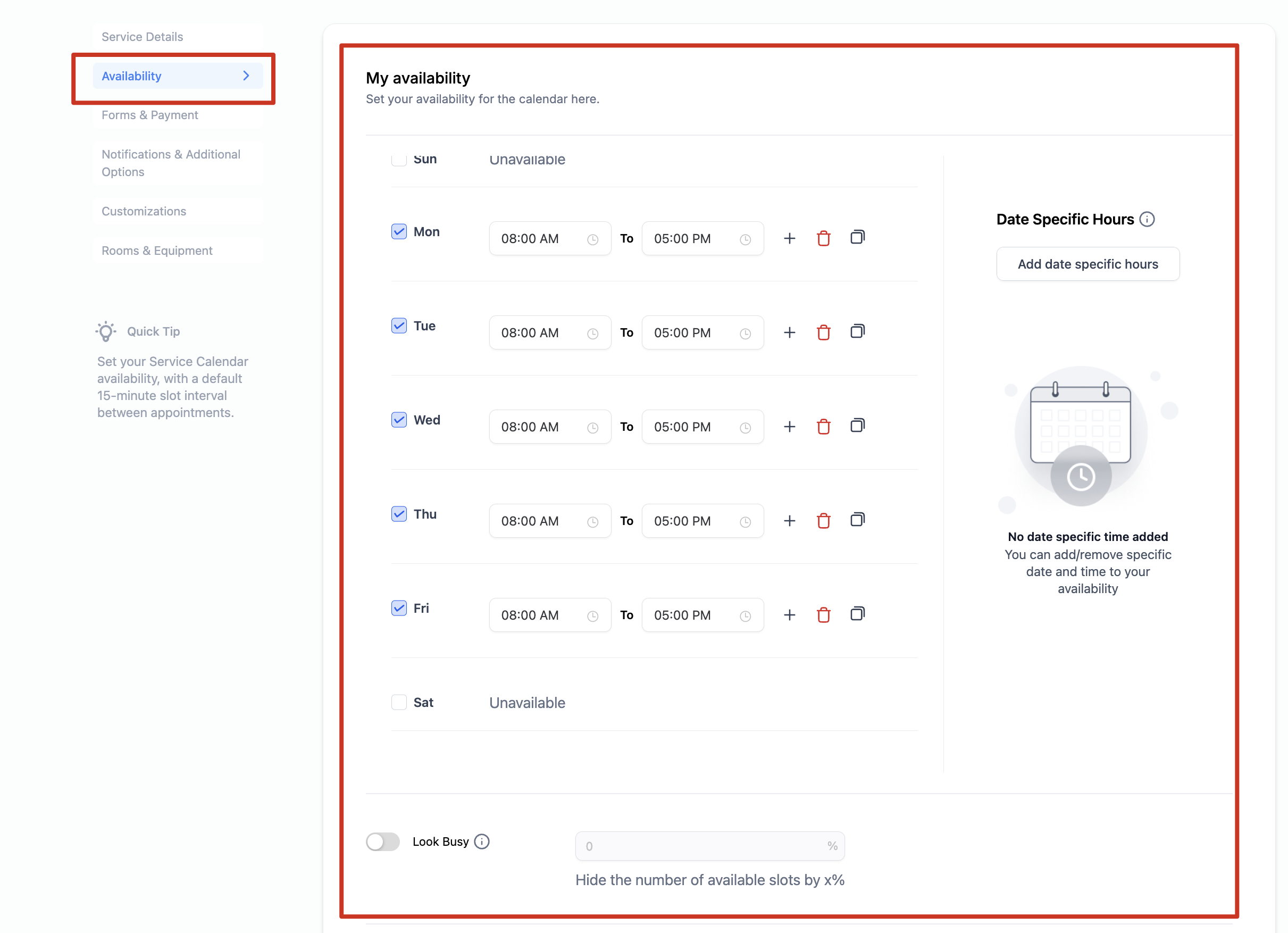 - Date Specific Hours: Set date-specific hours that allow you to customize your availability or unavailability for specific dates. You can add specific dates and define hours applicable only to those dates.