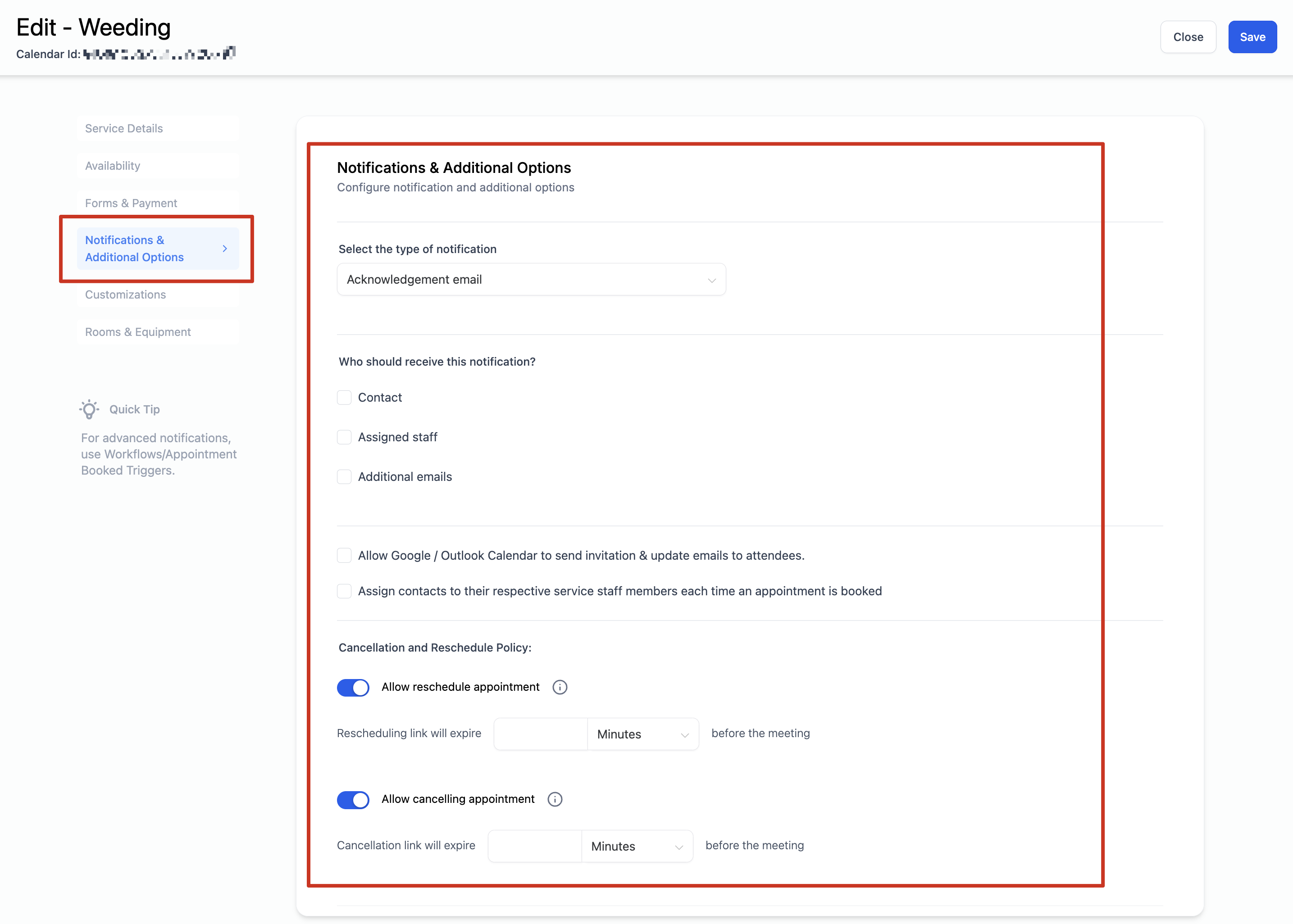 Notifications: You can select who should receive appointment notifications, and whether to allow Google to send invitation or update emails to attendees. You can also determine whether contacts should be assigned to their respective staff member each time an appointment is booked.