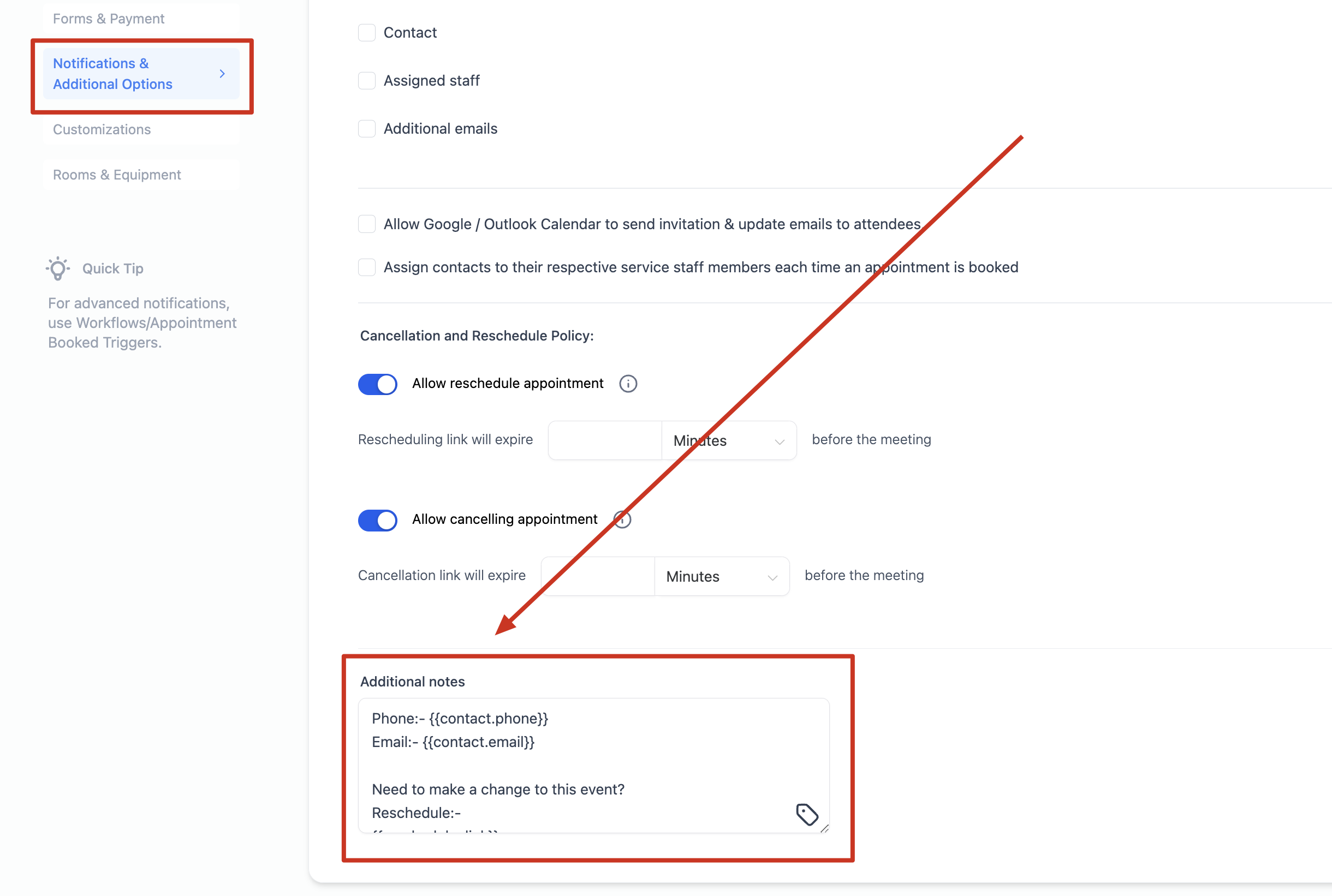 Additional Notes: Anything entered here will be included in the Google invitation. Please ensure that "Allow Google Calendar to Send Invitations" is enabled from 'Notifications' settings for this feature to work.